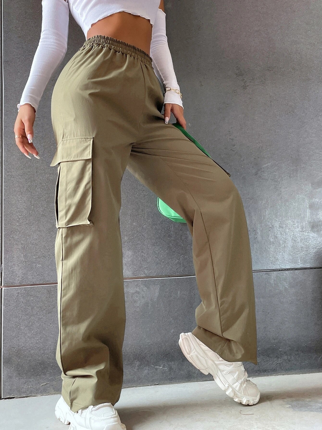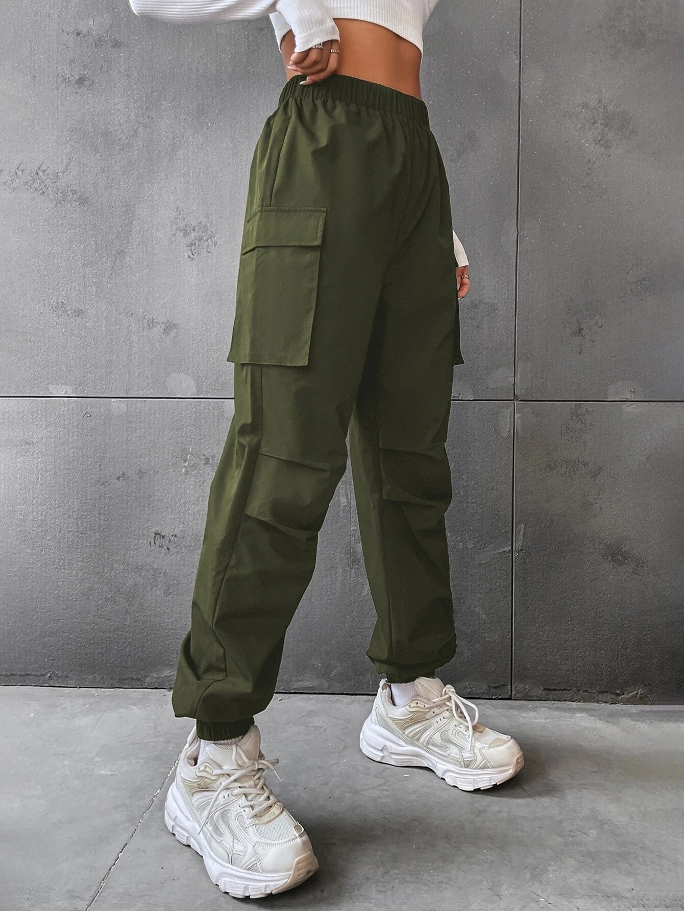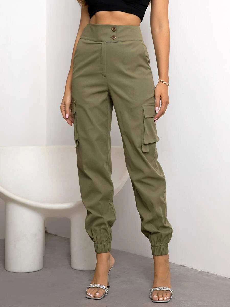 Solid High Waist Flap Pocket Cargo Pants