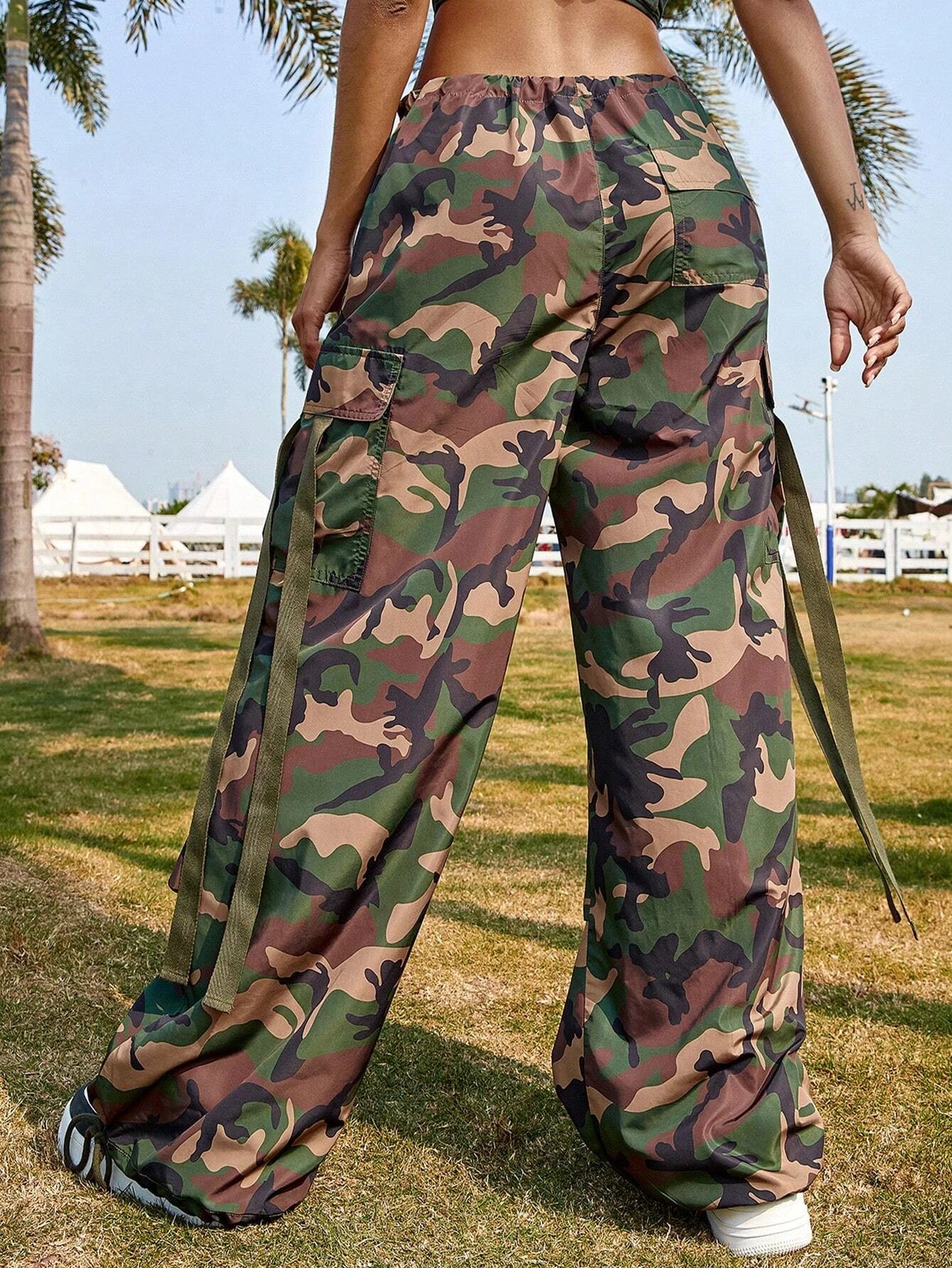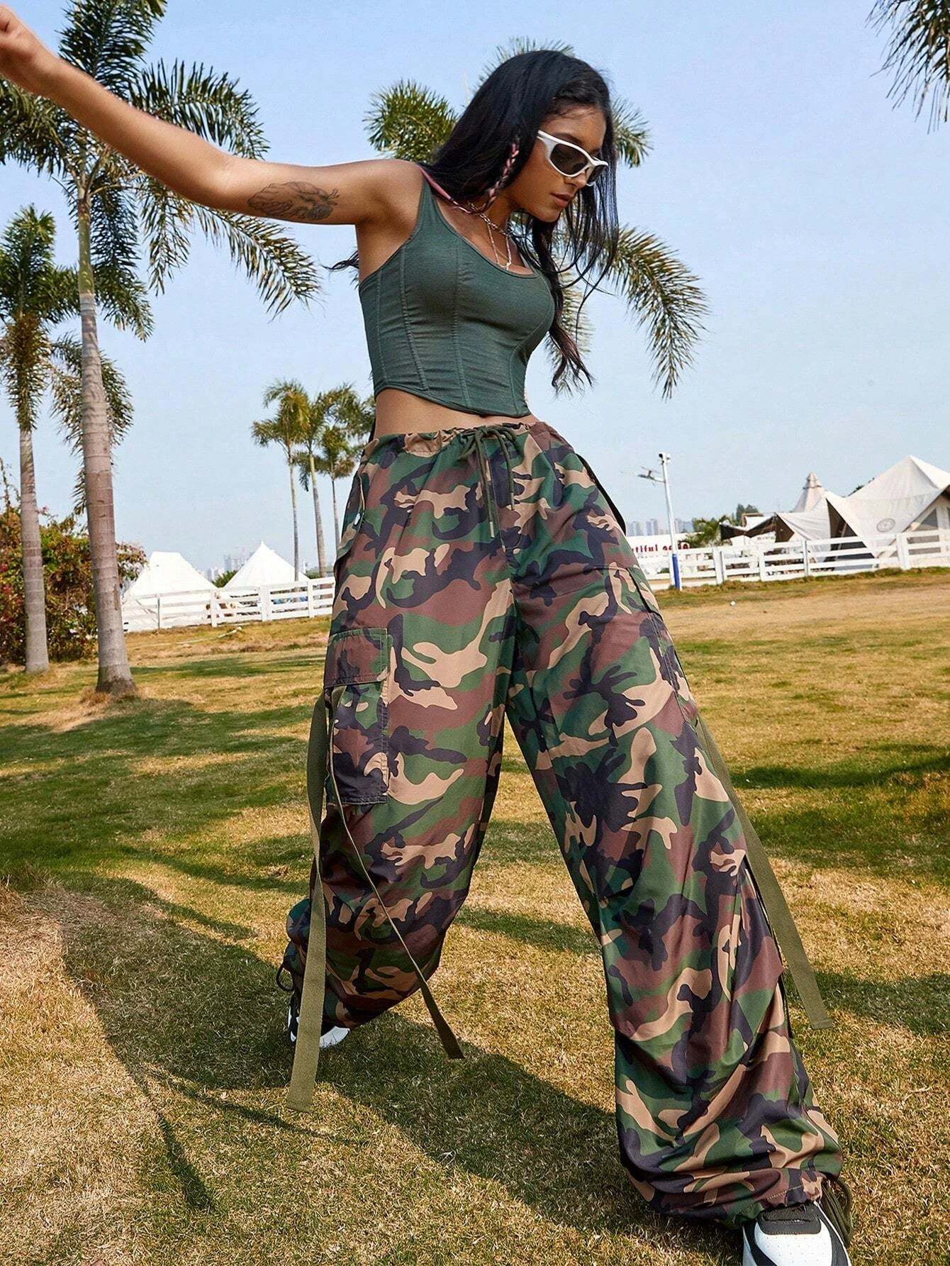 Step into the realm of urban fashion with these Camo Print Drawstring Cargo Parachute Pants, designed to make a powerful statement wherever you go. Embracing the spirit of rugged adventure, these pants effortlessly fuse functionality with an undeniable cool factor. The captivating camouflage print, reminiscent of untamed wilderness, lends an air of mystery and individuality to your ensemble.
