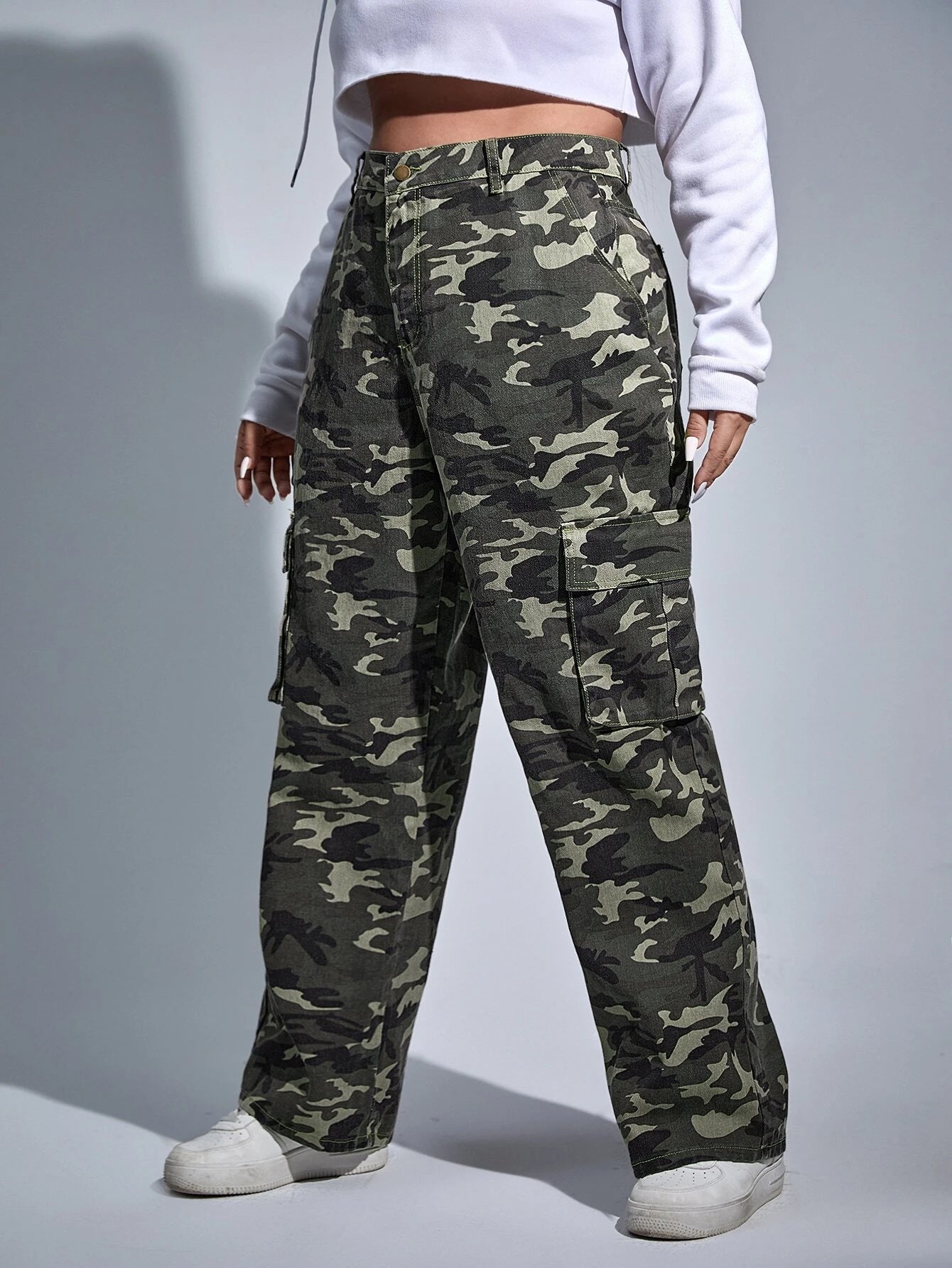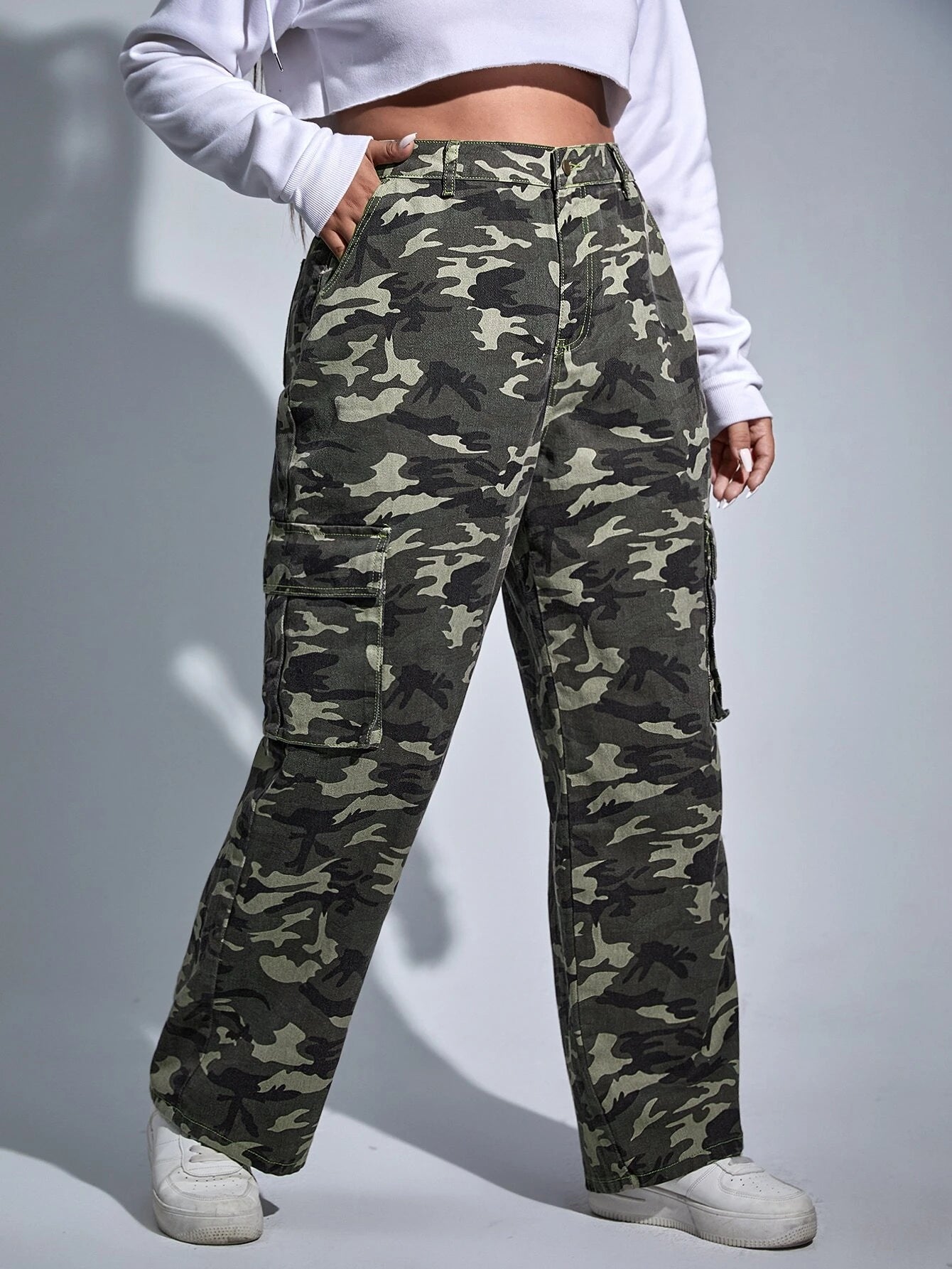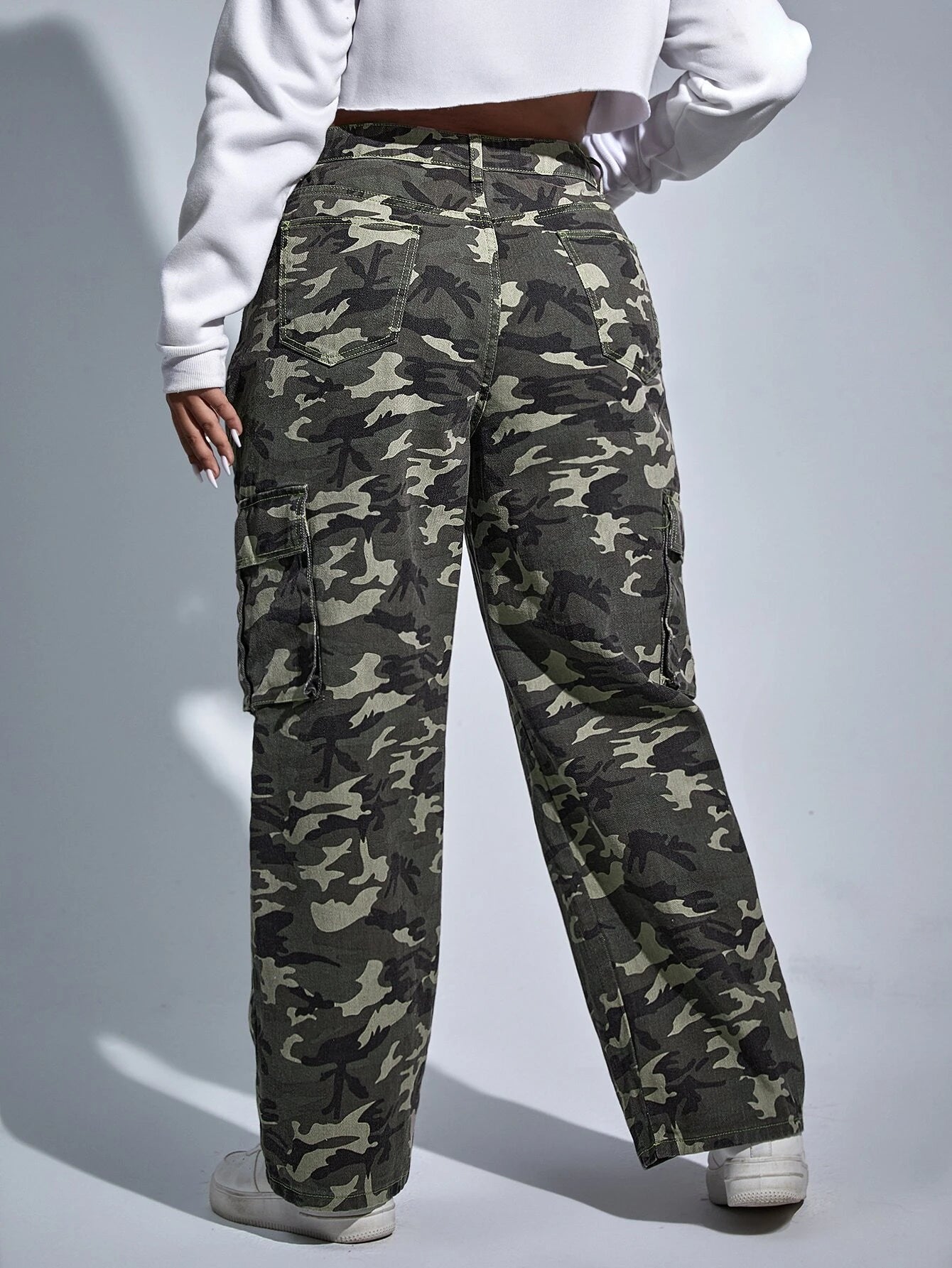 Make a statement with our Camouflage Print Cargo Jeans. These versatile pants feature a high waist and regular fit, ensuring a comfortable and flattering look. The non-stretch denim fabric offers durability, while the unique camouflage print exudes style.