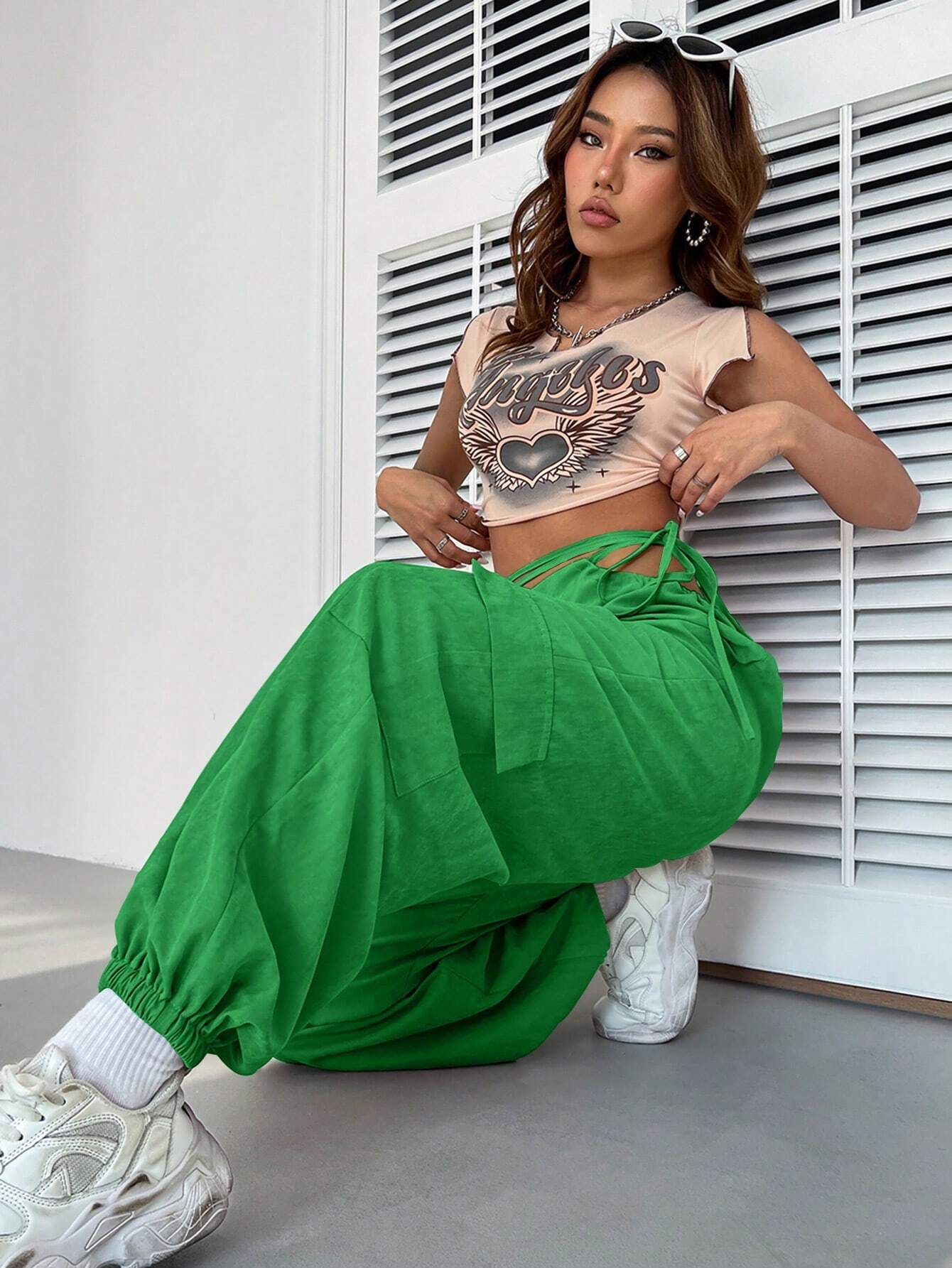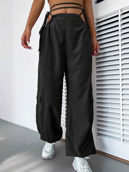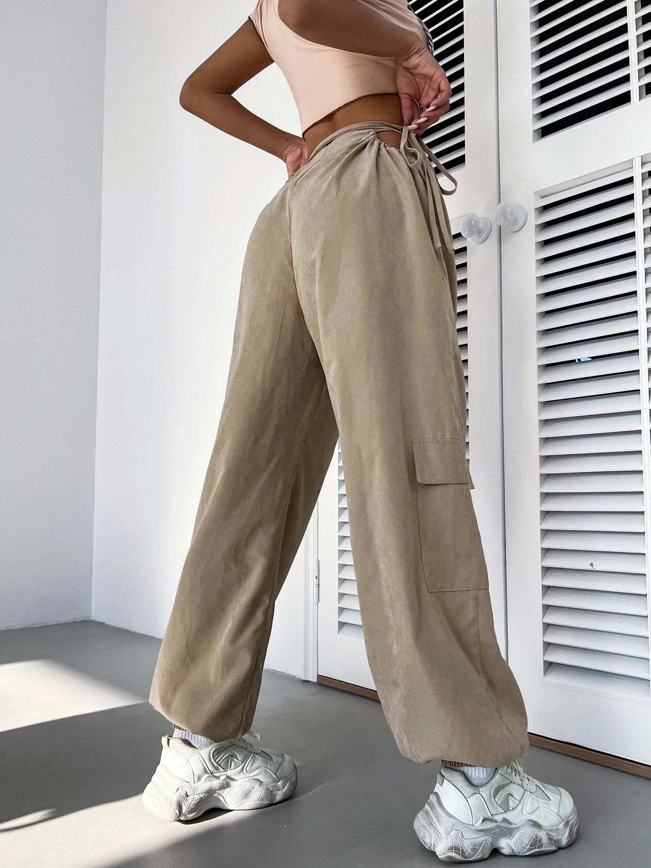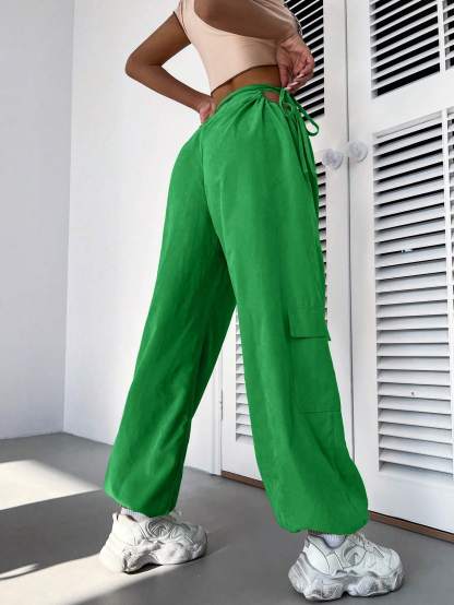 Stay effortlessly cool with our Casual Plain Drawstring Waist Cargo Pant. These pants offer a relaxed fit and a drawstring waist for a comfortable and adjustable fit. The plain design allows for easy pairing with various tops and accessories. Made from comfortable fabric, these cargo pants are perfect for casual outings or lounging at home, giving you a laid-back yet stylish vibe.
