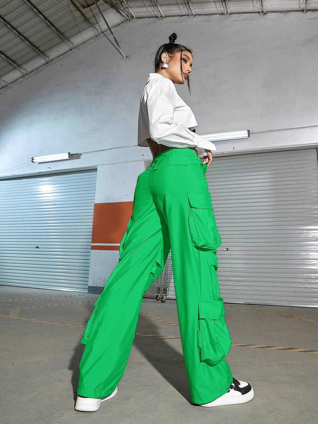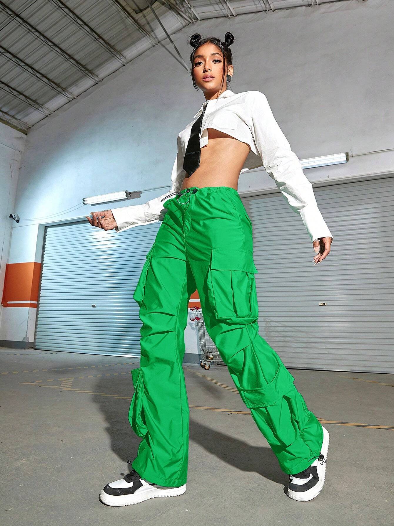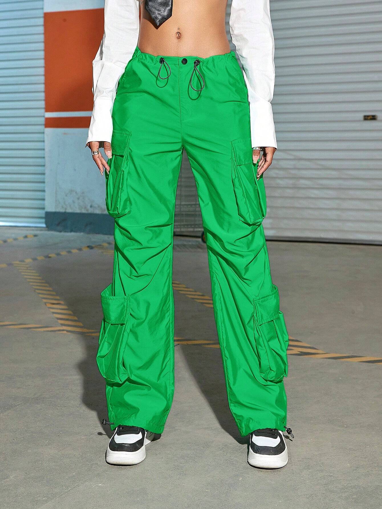 These Drawstring Ruched Cargo Parachute Pant cargo pants feature a ruched design with zipper details and pockets for added functionality. Made from a non-stretch fabric blend of Polyamide and Polyester, they offer a loose fit and a natural waistline. The pants are available in various sizes, ensuring a perfect fit. Experience effortless style and practicality with these trendy cargo pants.