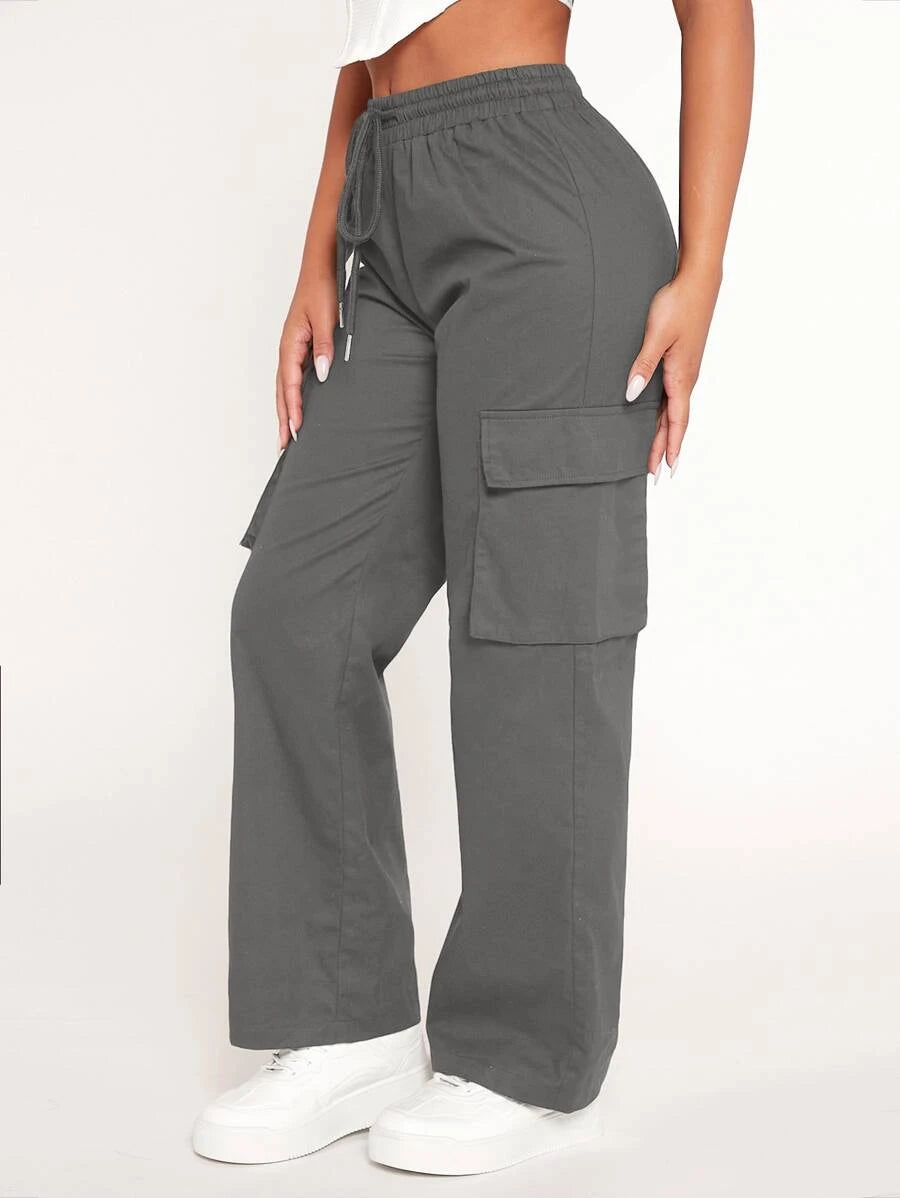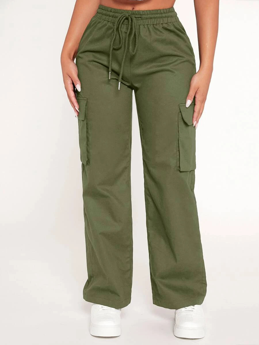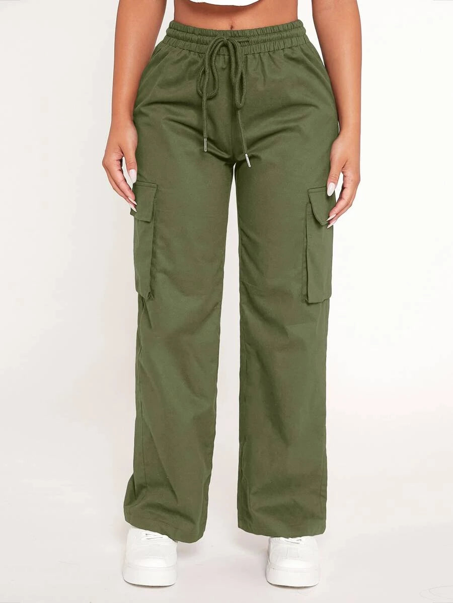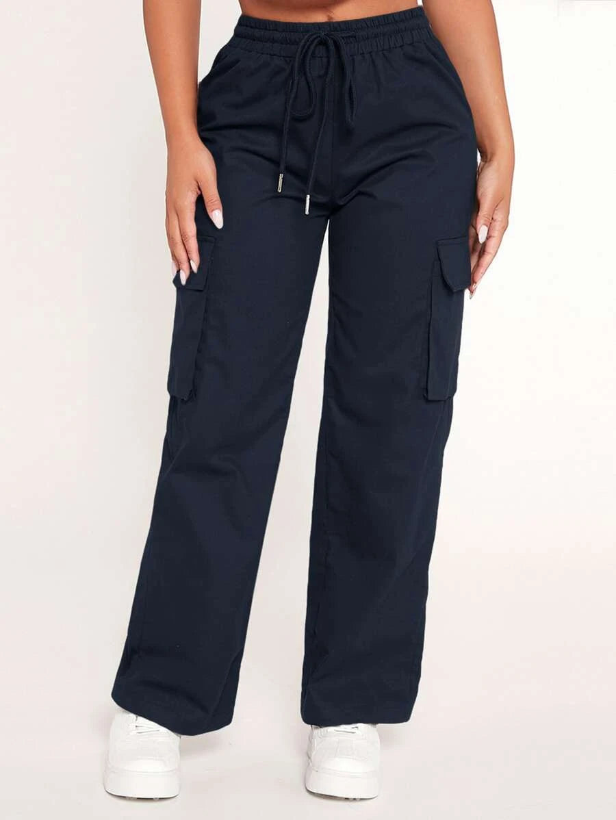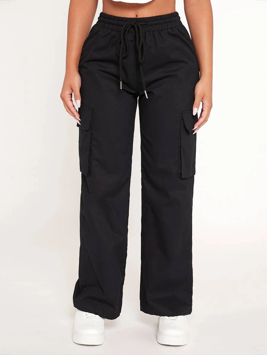Achieve a comfortable and stylish look with our Drawstring Waist Flap Pocket Cargo Pants. These pants feature a drawstring waist that allows for a customized and comfortable fit. The flap pockets on the front add a touch of utility and style to the design.