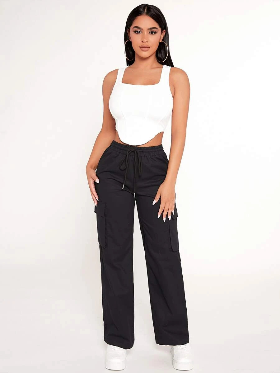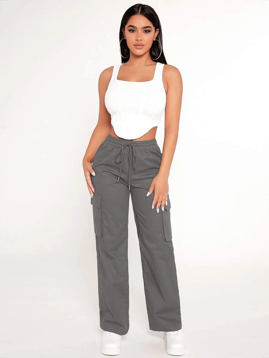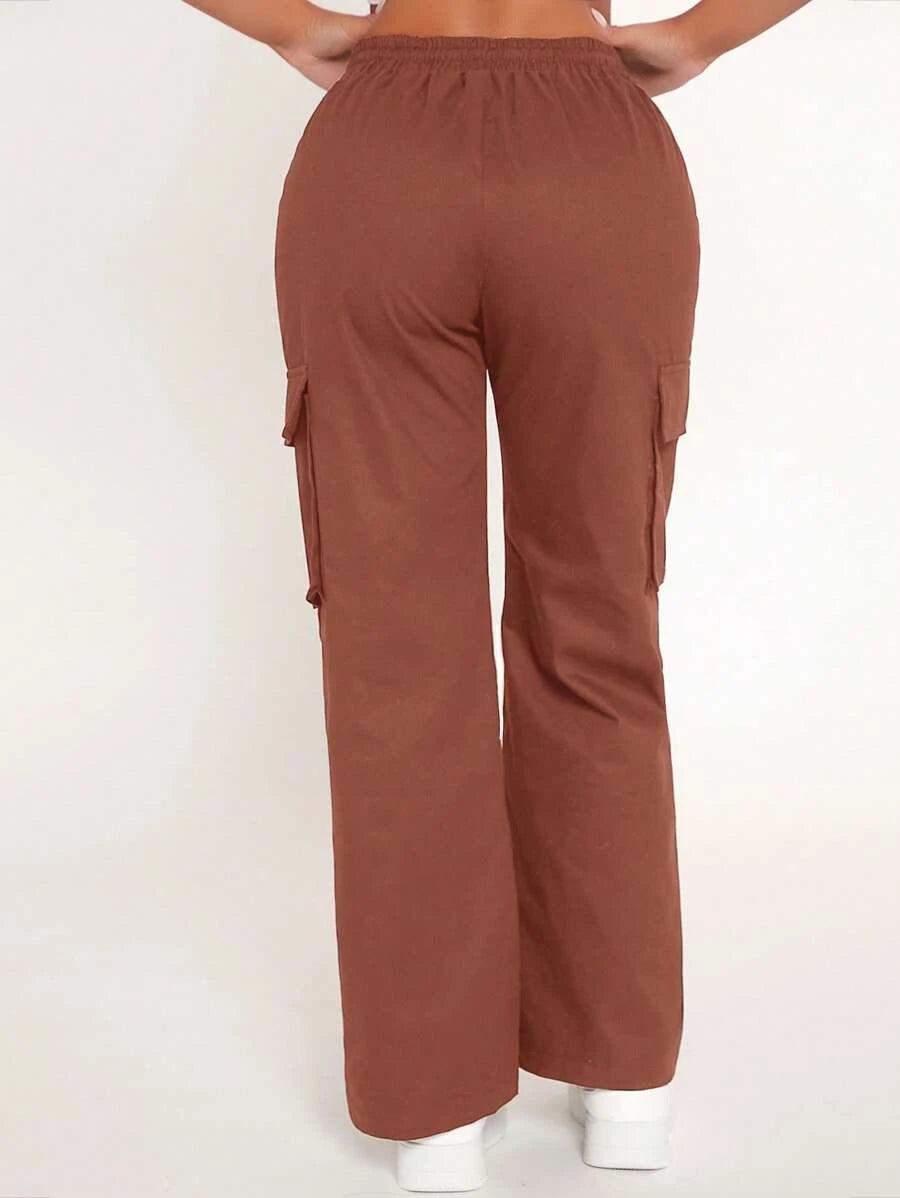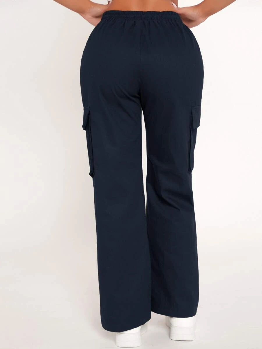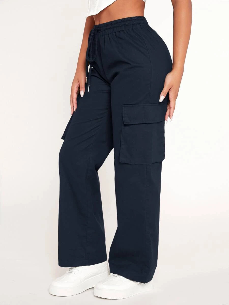 Achieve a comfortable and stylish look with our Drawstring Waist Flap Pocket Cargo Pants. These pants feature a drawstring waist that allows for a customized and comfortable fit. The flap pockets on the front add a touch of utility and style to the design.