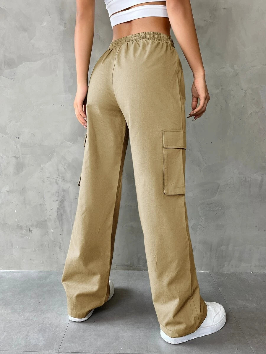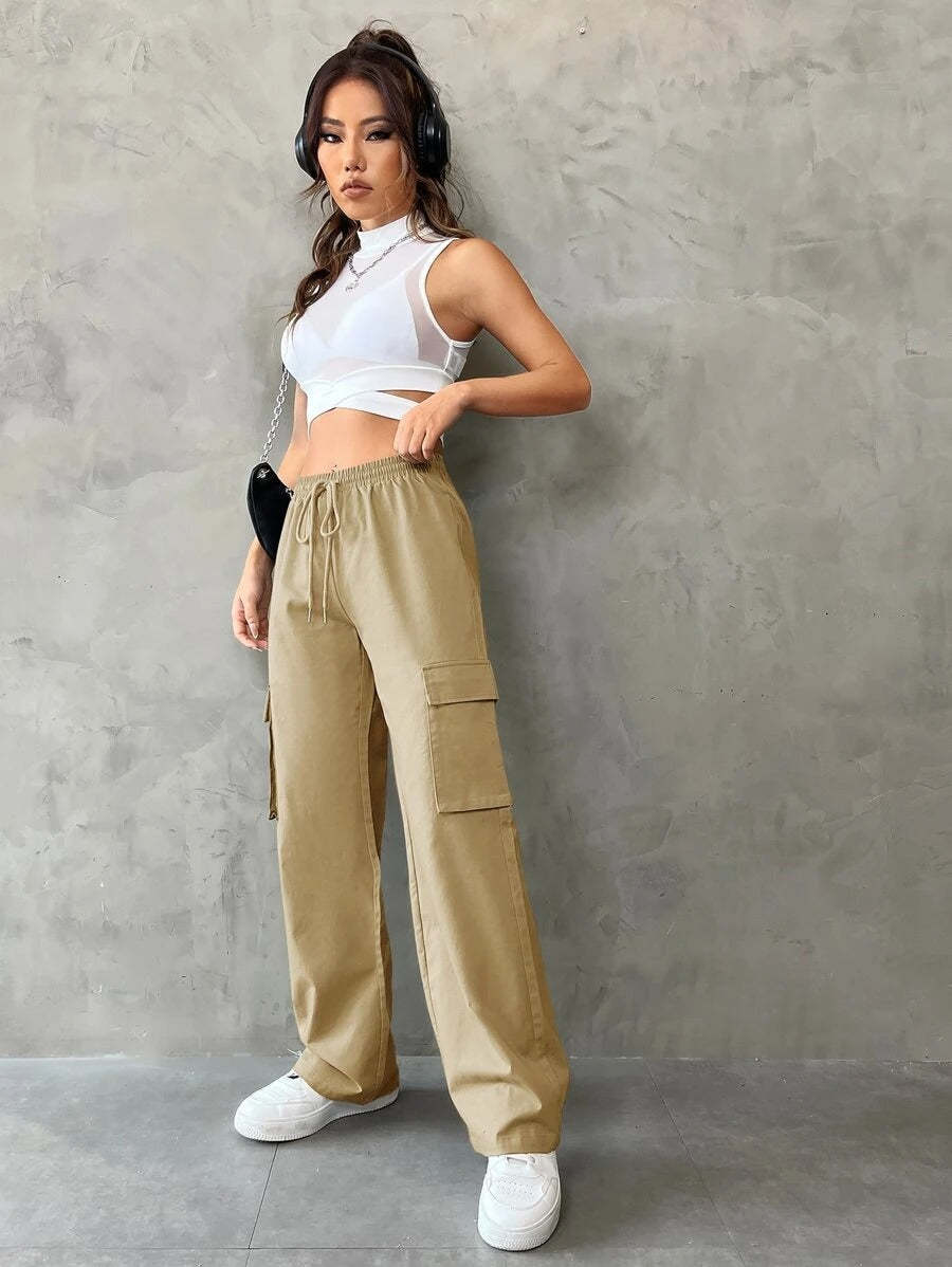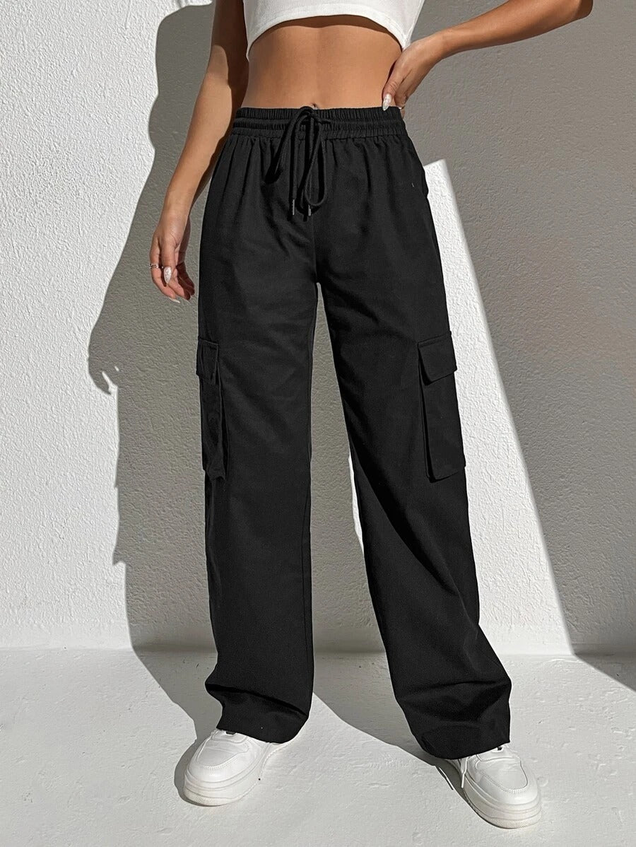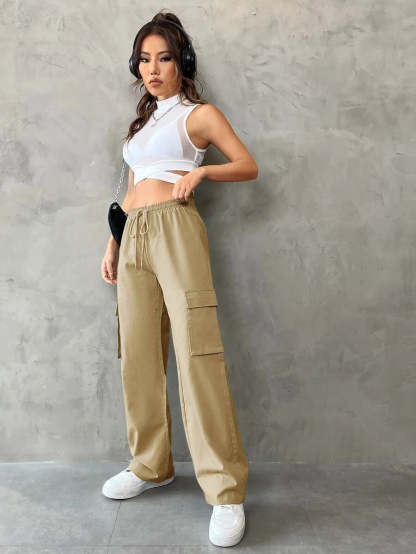 Introducing the epitome of utilitarian fashion, the Flap Pocket Drawstring Waist Cargo Pants. This sartorial masterpiece effortlessly merges functionality with undeniable sophistication. Crafted with meticulous attention to detail, these pants boast an abundance of well-placed pockets, offering a harmonious balance between practicality and elegance. Let these pants be a statement of your individuality, a testament to your discerning taste, and an embodiment of your adventurous spirit.