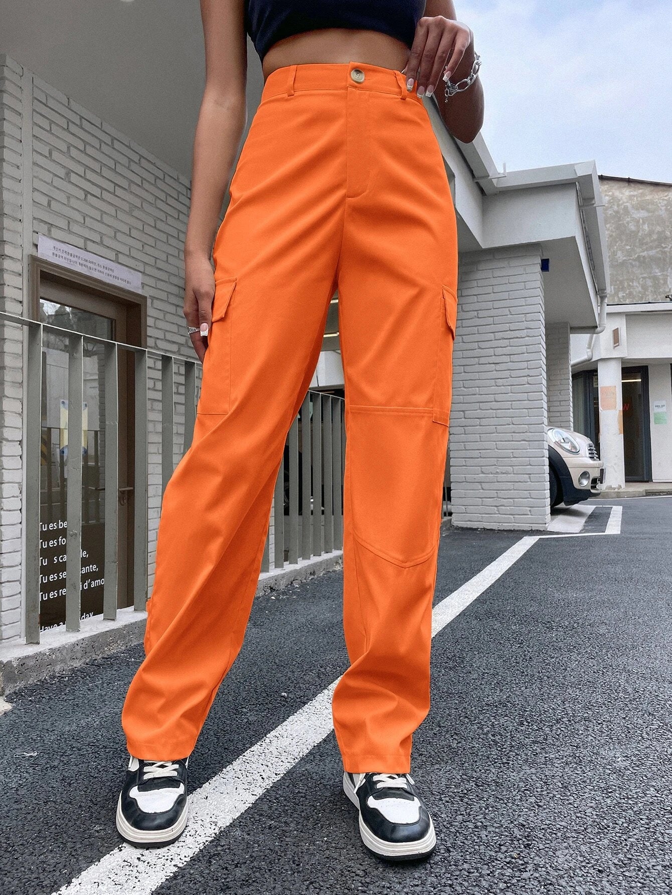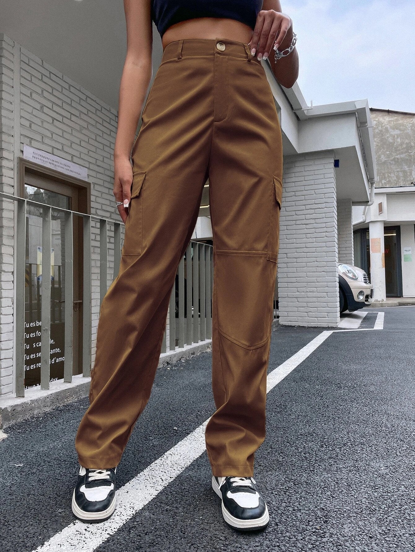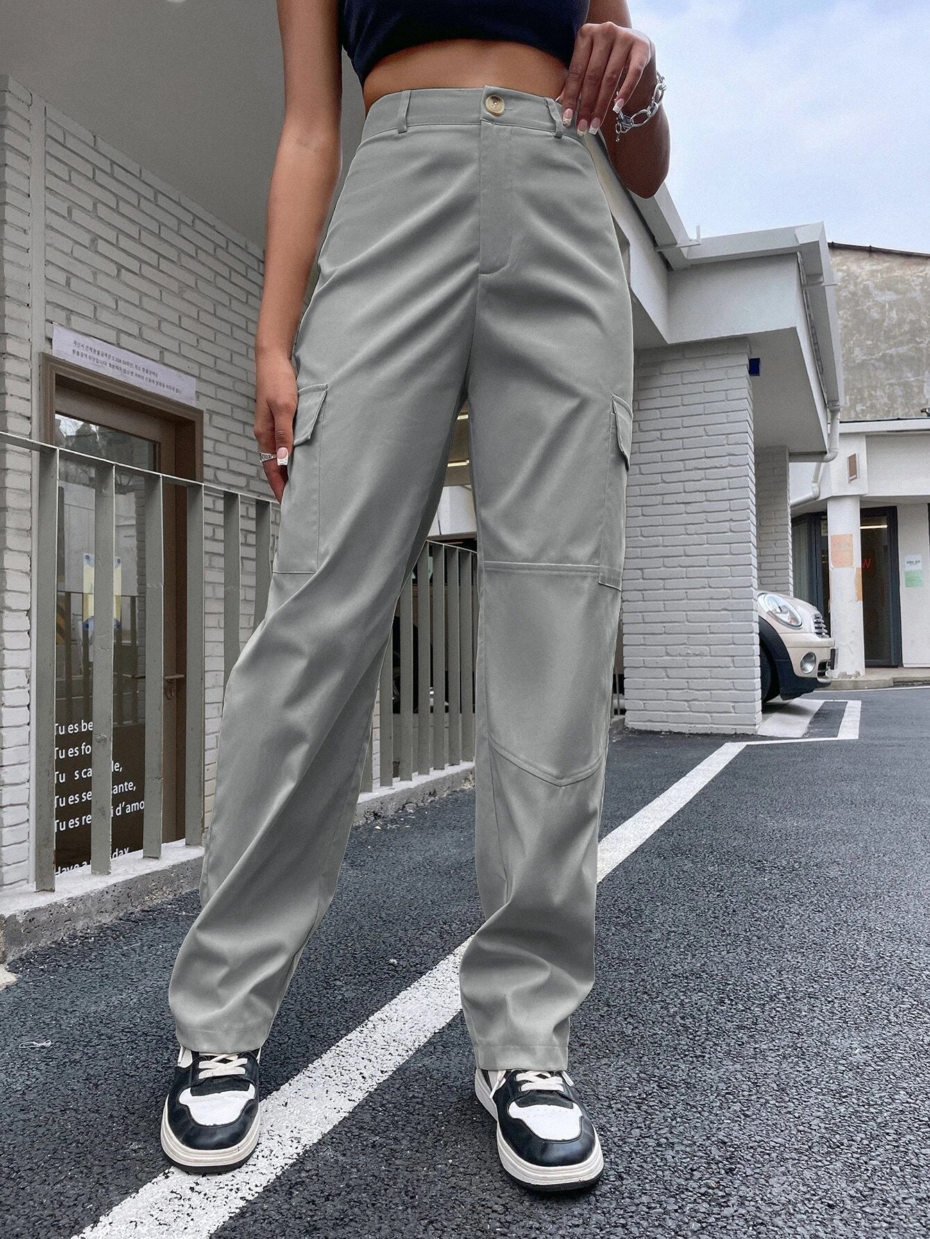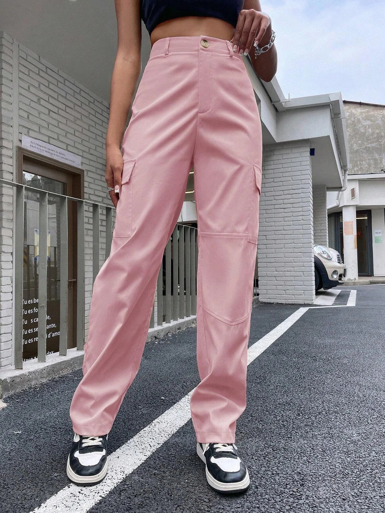 Introducing the epitome of effortless style and practicality, behold the High Waist Flap Pocket Side Cargo Pants. These fashion-forward trousers exude an air of confidence and sophistication, perfect for the discerning fashion connoisseur. Indulge in the versatility of these cargo pants, as they effortlessly transition from casual outings to more refined affairs. The impeccable tailoring ensures a flawless fit, accentuating your natural curves while providing comfortable and unrestricted wear.