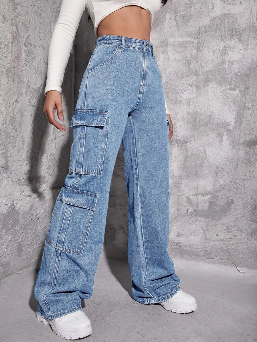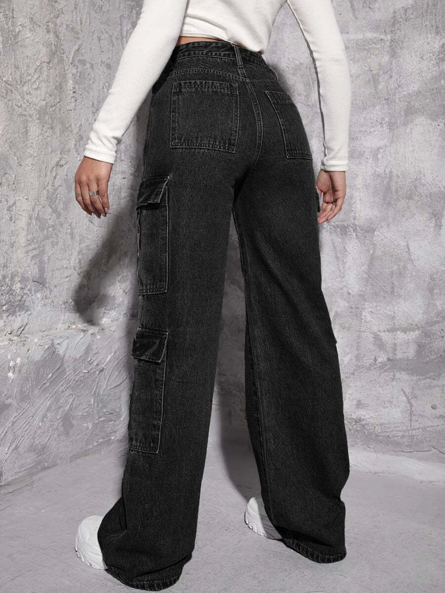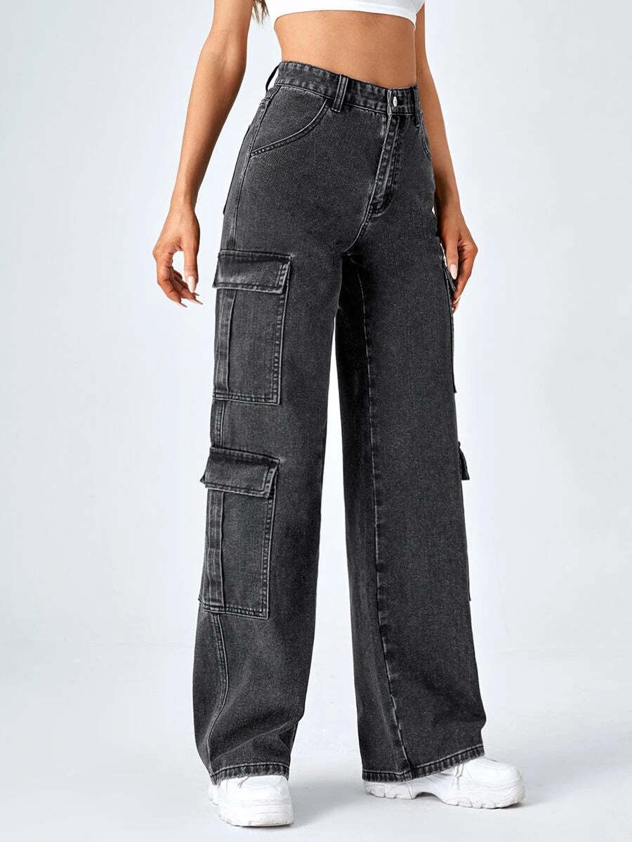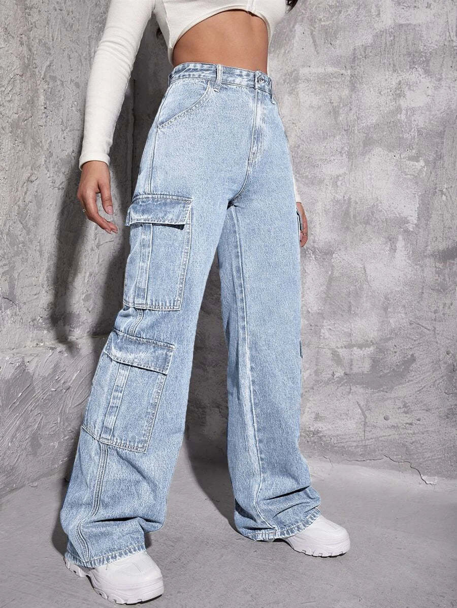 Upgrade your denim collection with our High Waist Zipper Fly Flap Pocket Cargo Jeans. These jeans feature a high waistline that accentuates your curves and adds a touch of sophistication to your outfit. The zipper fly closure adds a modern and edgy touch to the jeans, while the flap pockets on the front provide both style and functionality.