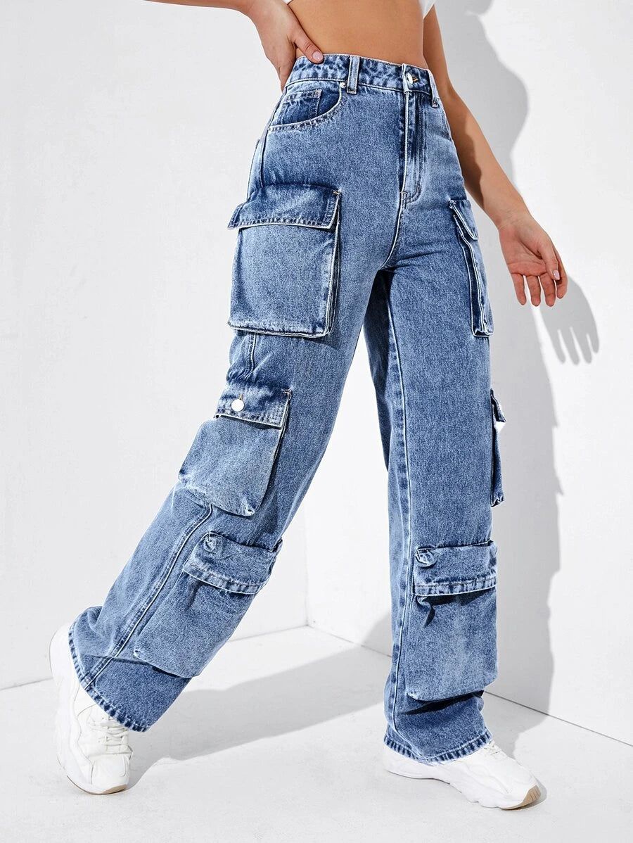 Upgrade your denim game with our High Waisted Flap Pocket Cargo Jeans. These jeans feature a high-waisted design that flatters your figure and offers a trendy look. The flap pockets add a touch of functionality and style to the overall design. Crafted with high-quality materials, these cargo jeans ensure durability and all-day comfort.