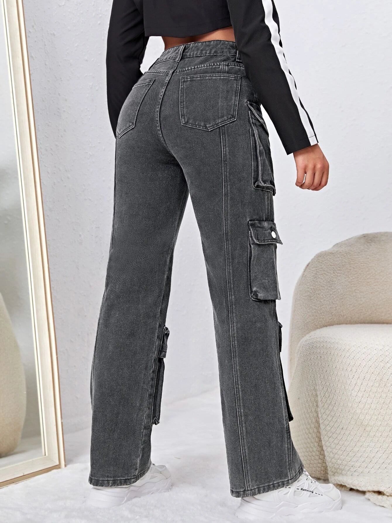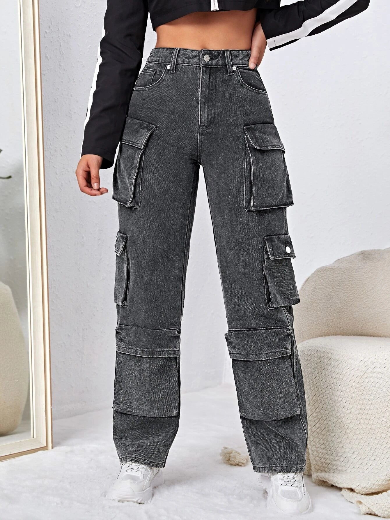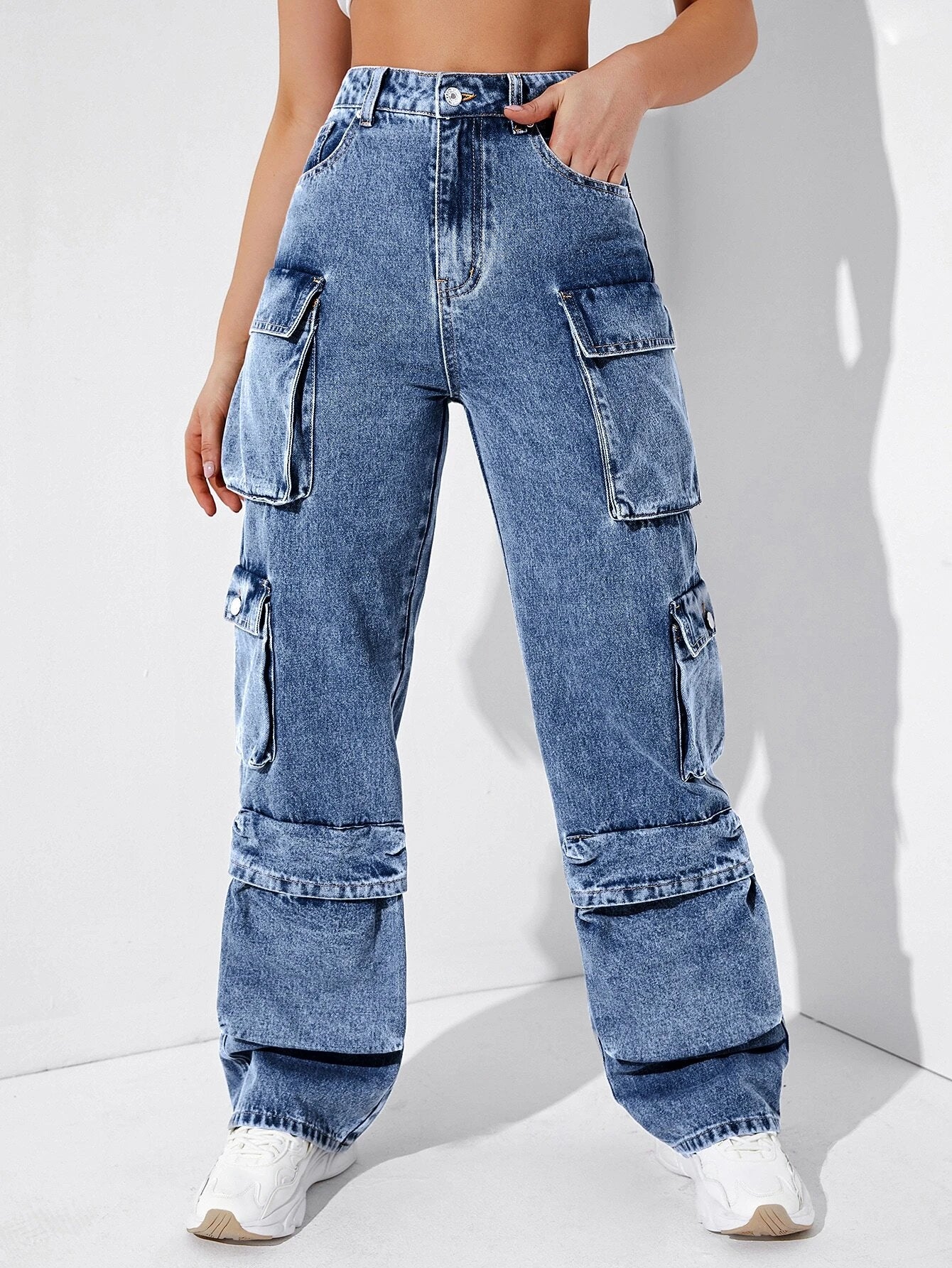 Embrace the latest fashion trends with our High Waisted Flap Pocket Cargo Jeans. The loose fit and high waistline create a flattering and comfortable silhouette that is perfect for everyday wear. Crafted from non-stretch denim, these jeans offer durability and style in one package.