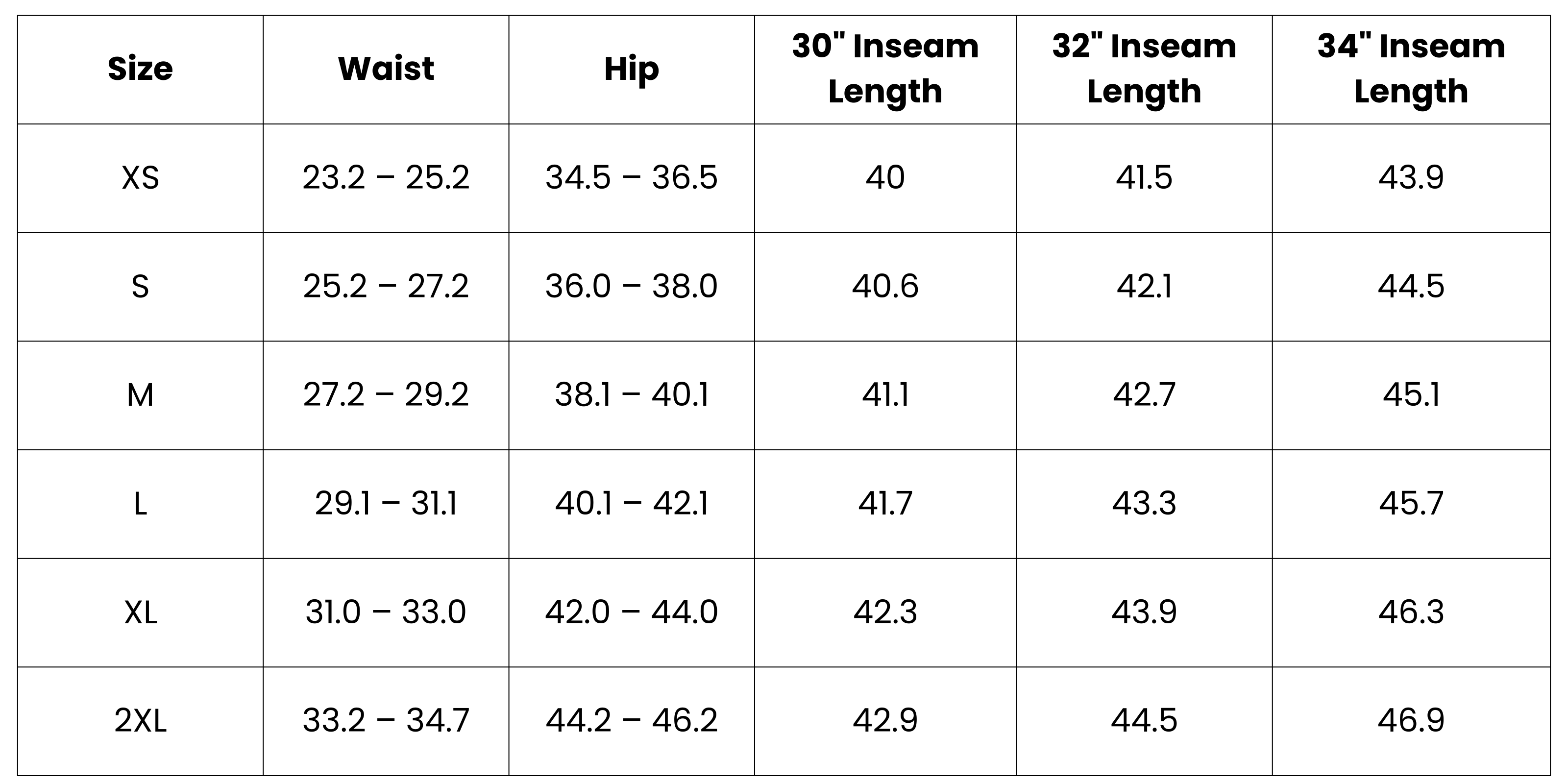 Size Chart (inches):