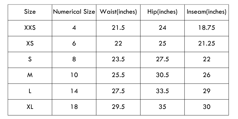 Size Chart (inches):