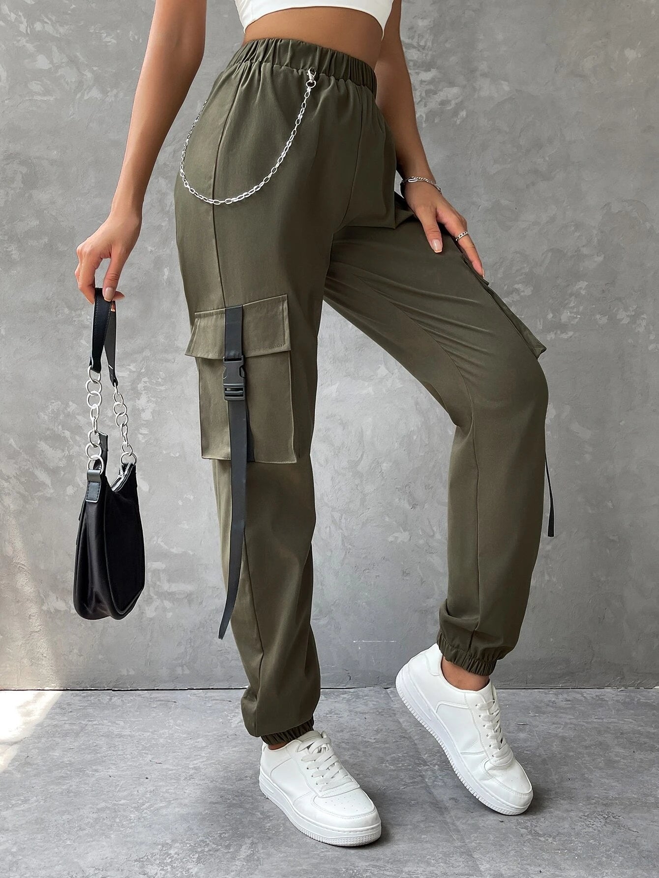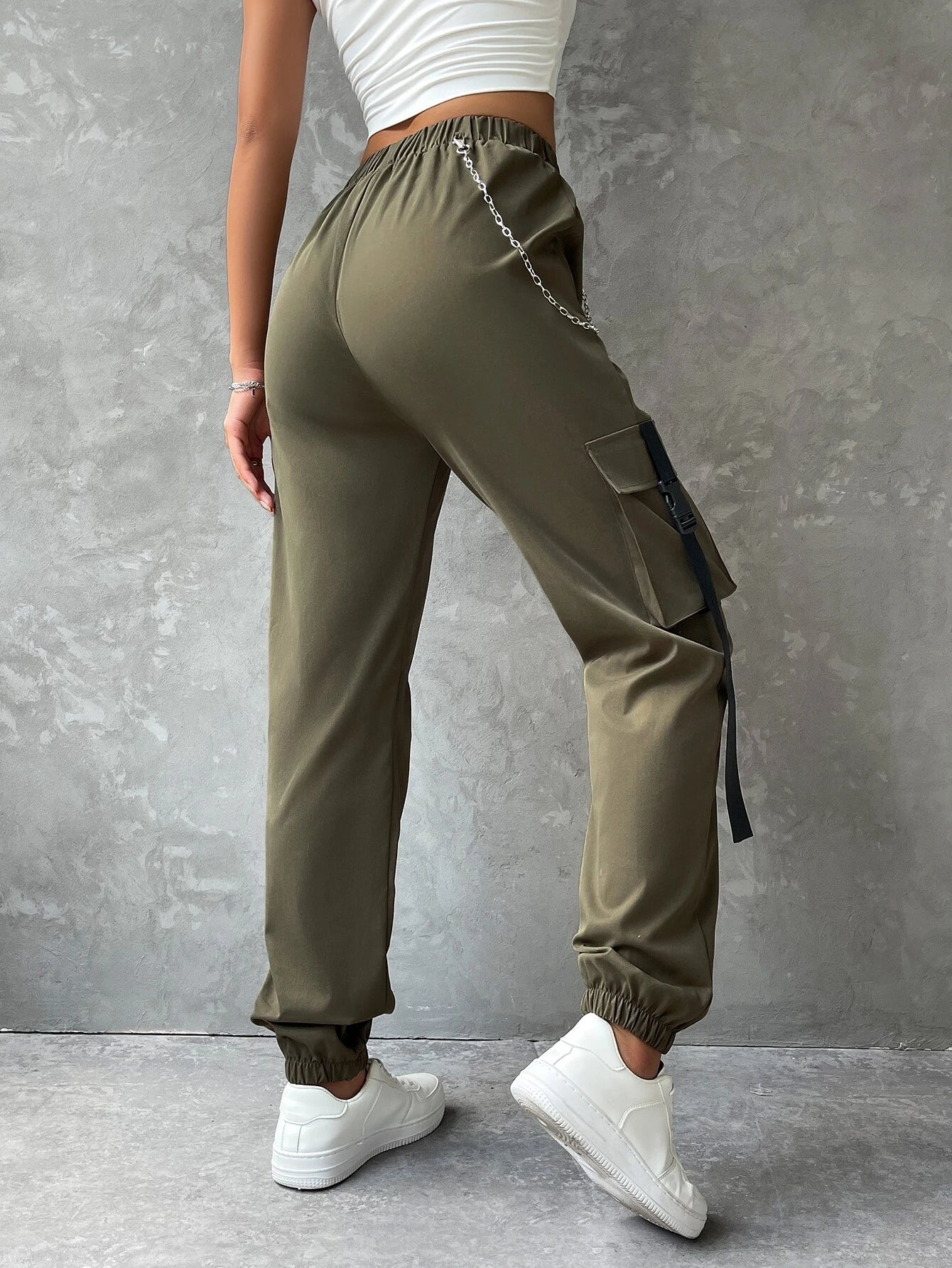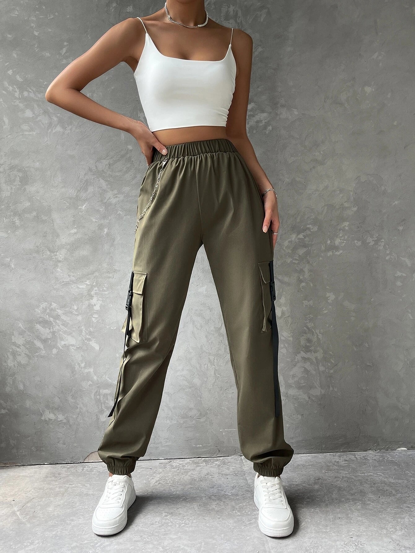 This Pocket Buckle Tape Cargo Pant is the perfect addition to your casual wardrobe. Made from a polyester fabric with a slight stretch, these cargo pants offer both comfort and durability. With a high waistline and regular fit, they are designed for all-day wear. Featuring a unique chain and tape detail, and multiple pockets for storage, these pants are both stylish and practical.