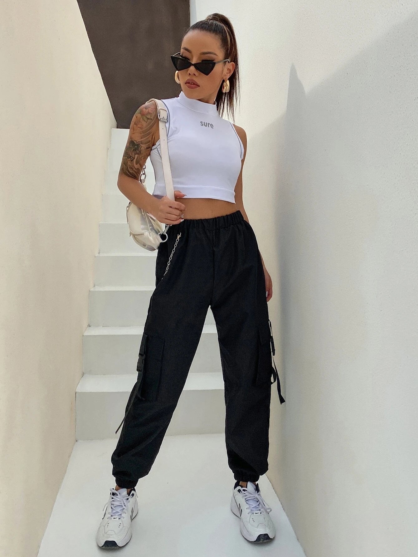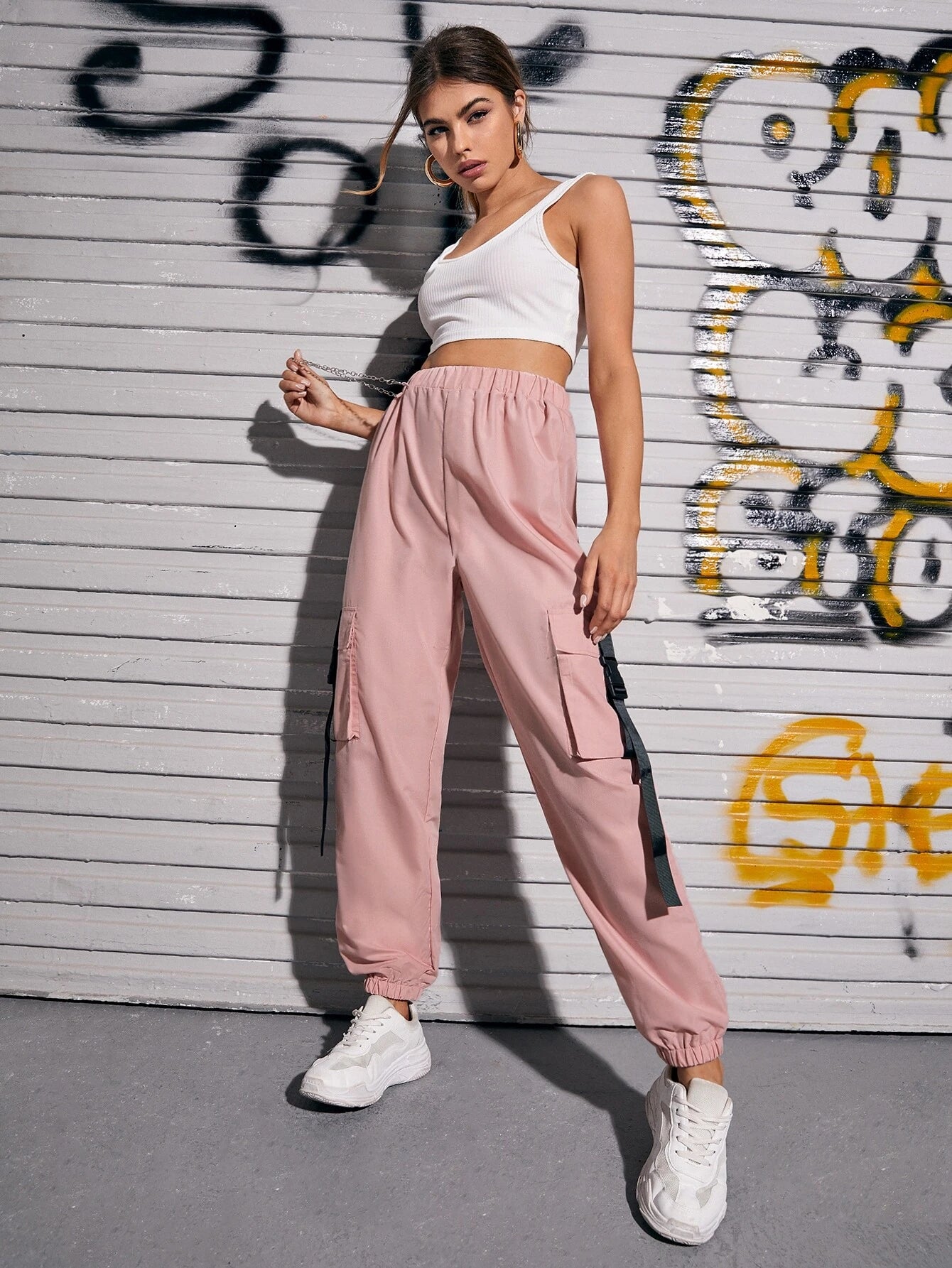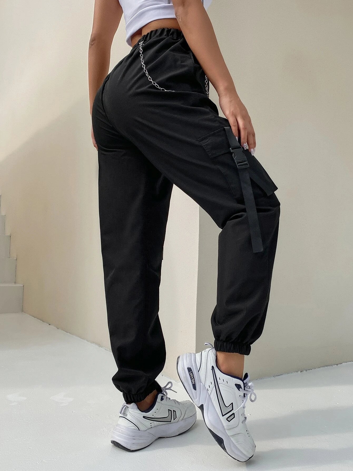 This Pocket Buckle Tape Cargo Pant is the perfect addition to your casual wardrobe. Made from a polyester fabric with a slight stretch, these cargo pants offer both comfort and durability. With a high waistline and regular fit, they are designed for all-day wear. Featuring a unique chain and tape detail, and multiple pockets for storage, these pants are both stylish and practical.