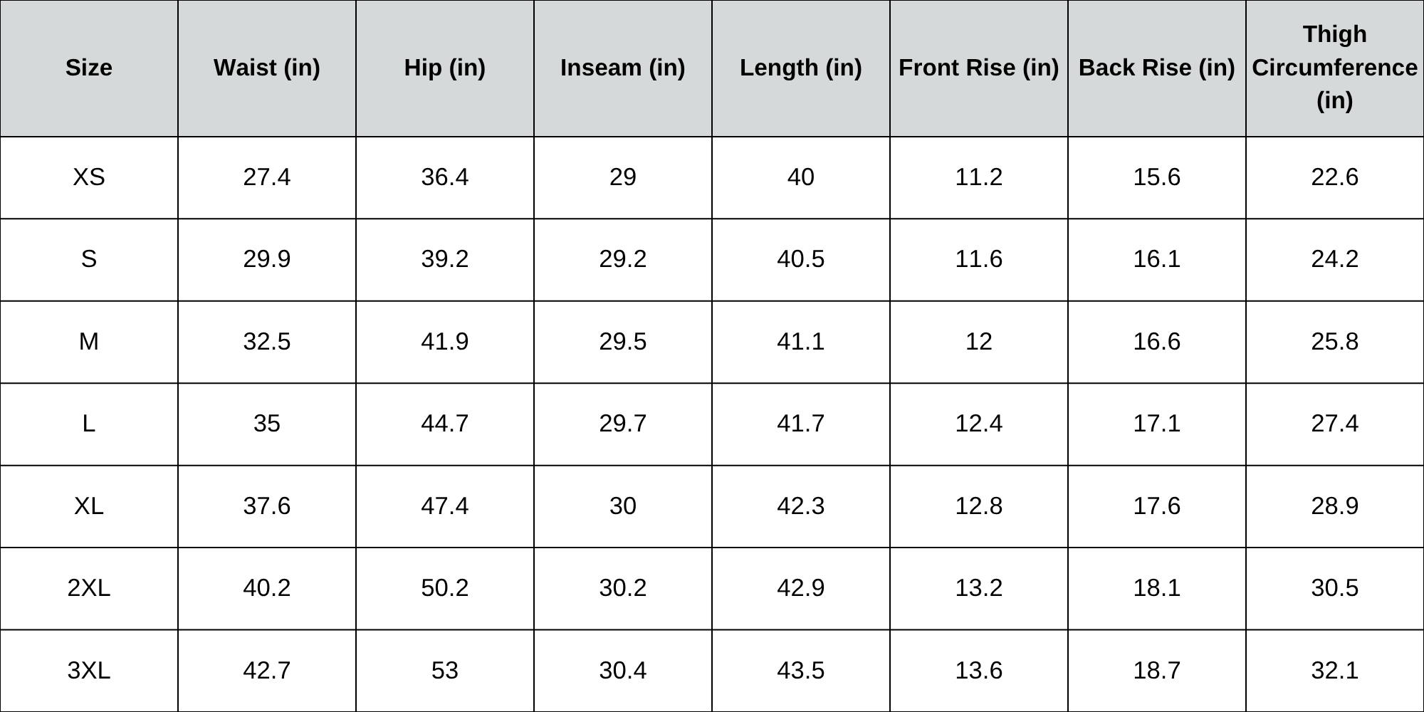 Size Chart (inches):