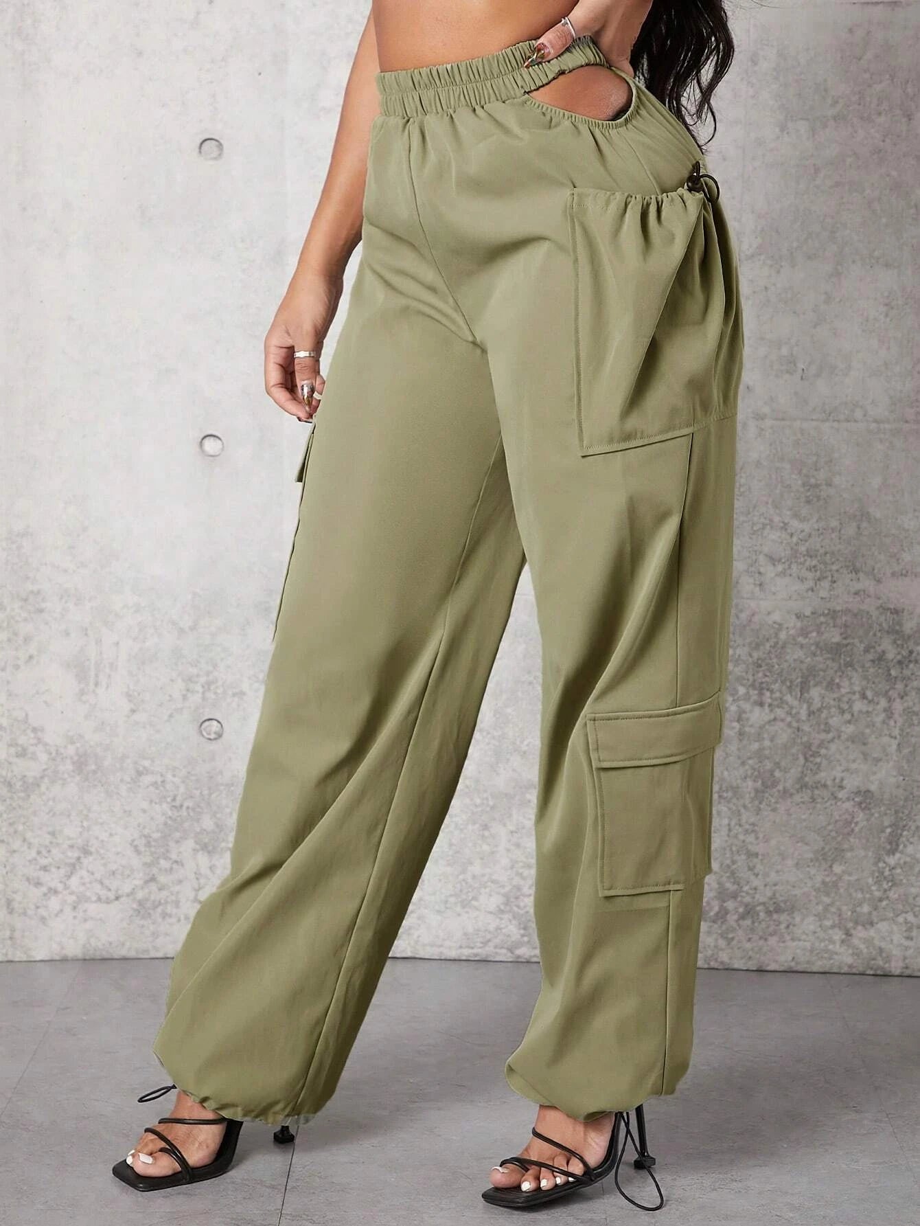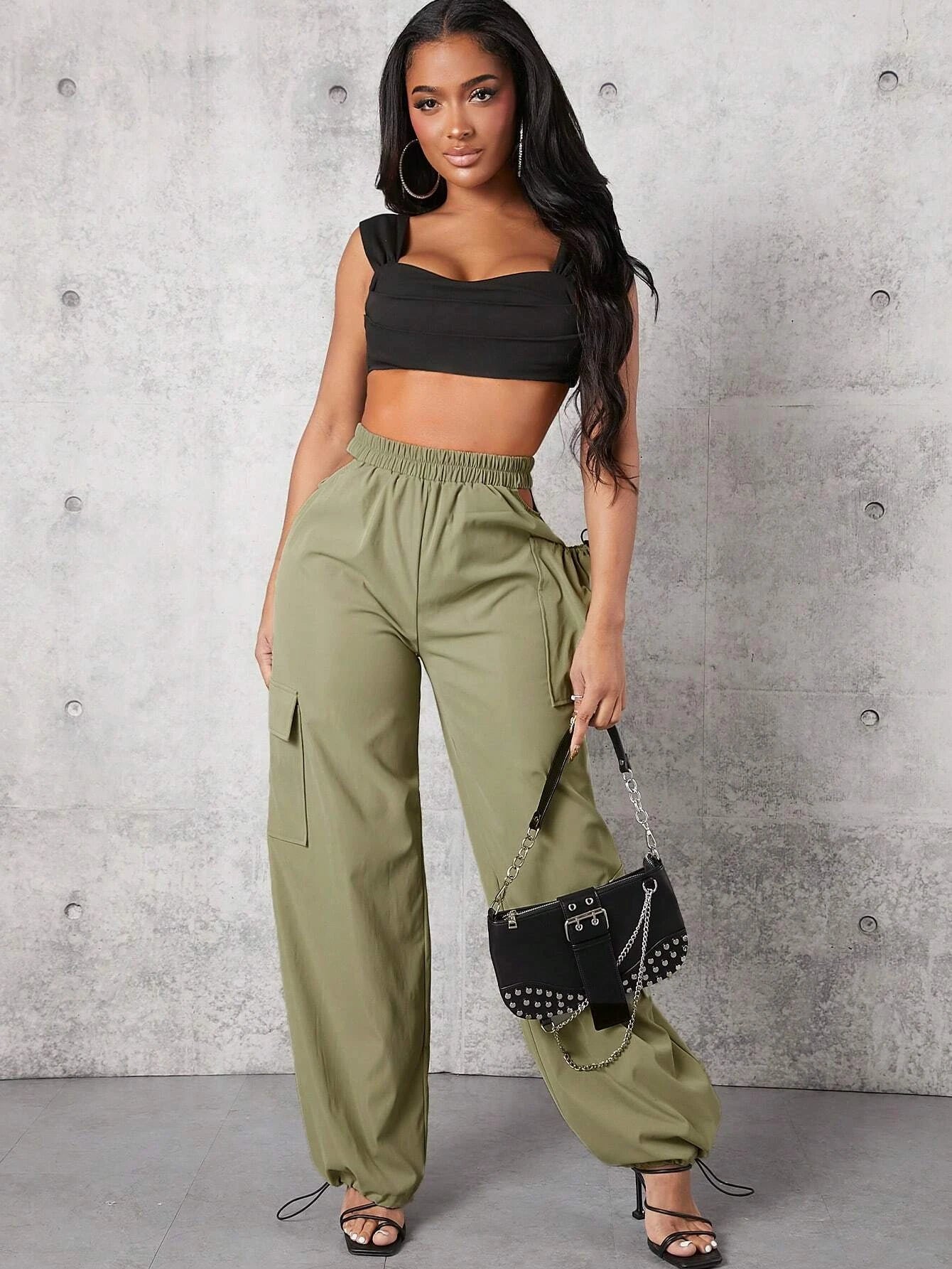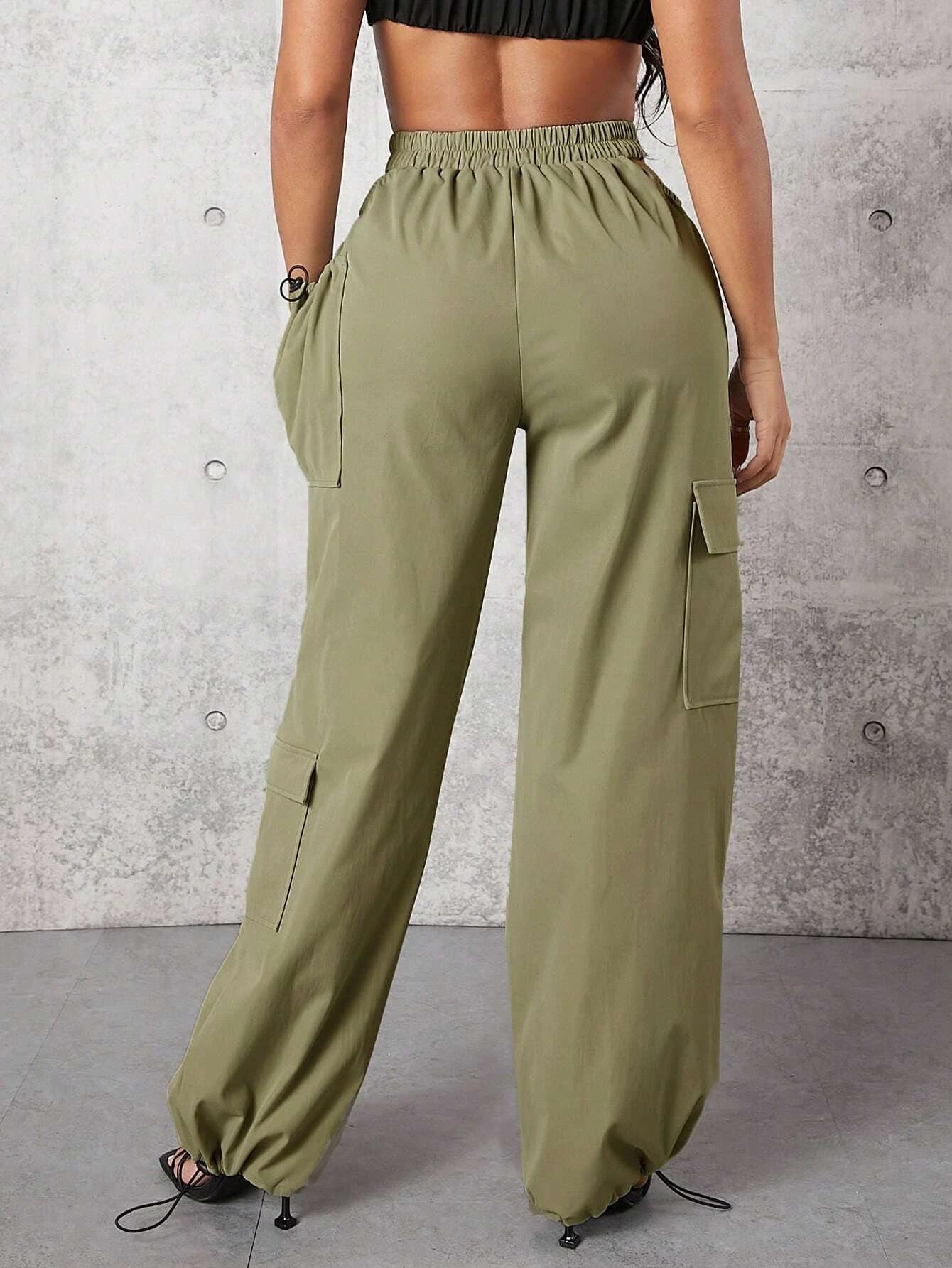Elevate your casual style with these Solid Color Flap Pocket Drawstring Hem Cargo Pants. Crafted from high-quality woven fabric, they offer a regular fit and a flattering high waistline. The drawstring hem adds a touch of versatility to these long-length pants.