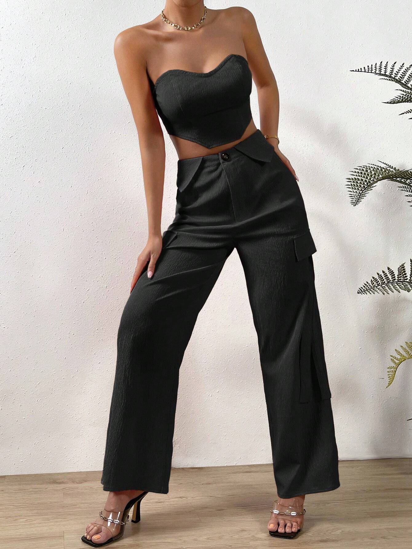 Exude effortless sophistication with our Solid Tube Top And Flap Pocket Side Cargo Pants. These pants are the perfect blend of style and functionality, featuring a solid colorway and flap pockets for extra storage. Whether you’re going for an edgy or classic look, these pants will cover you in all the right ways while the top will simply add to its elegance. Available in elegant black, striking orange, and a muted grey.