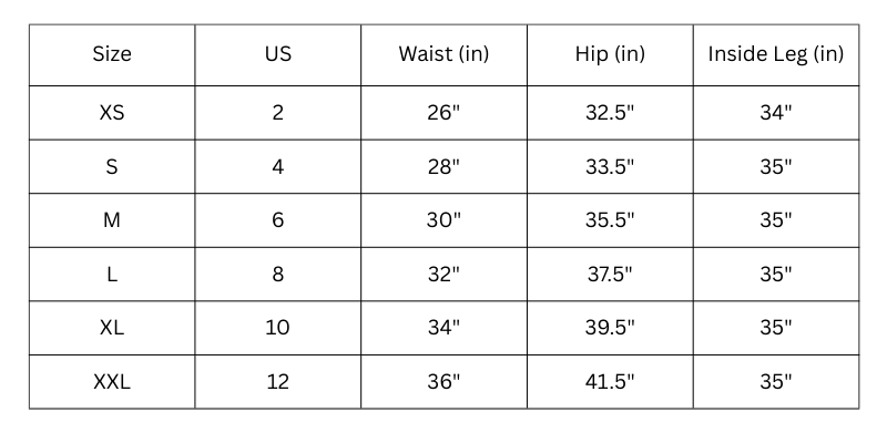 Size Chart (inches):