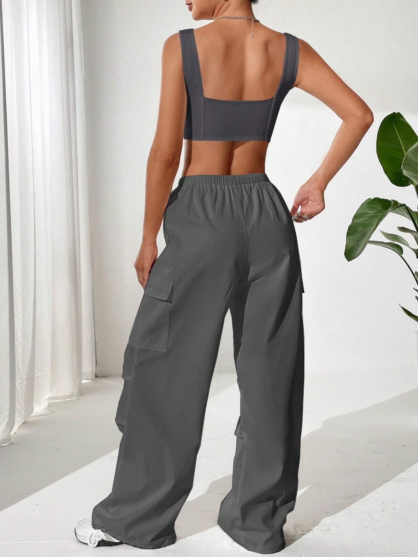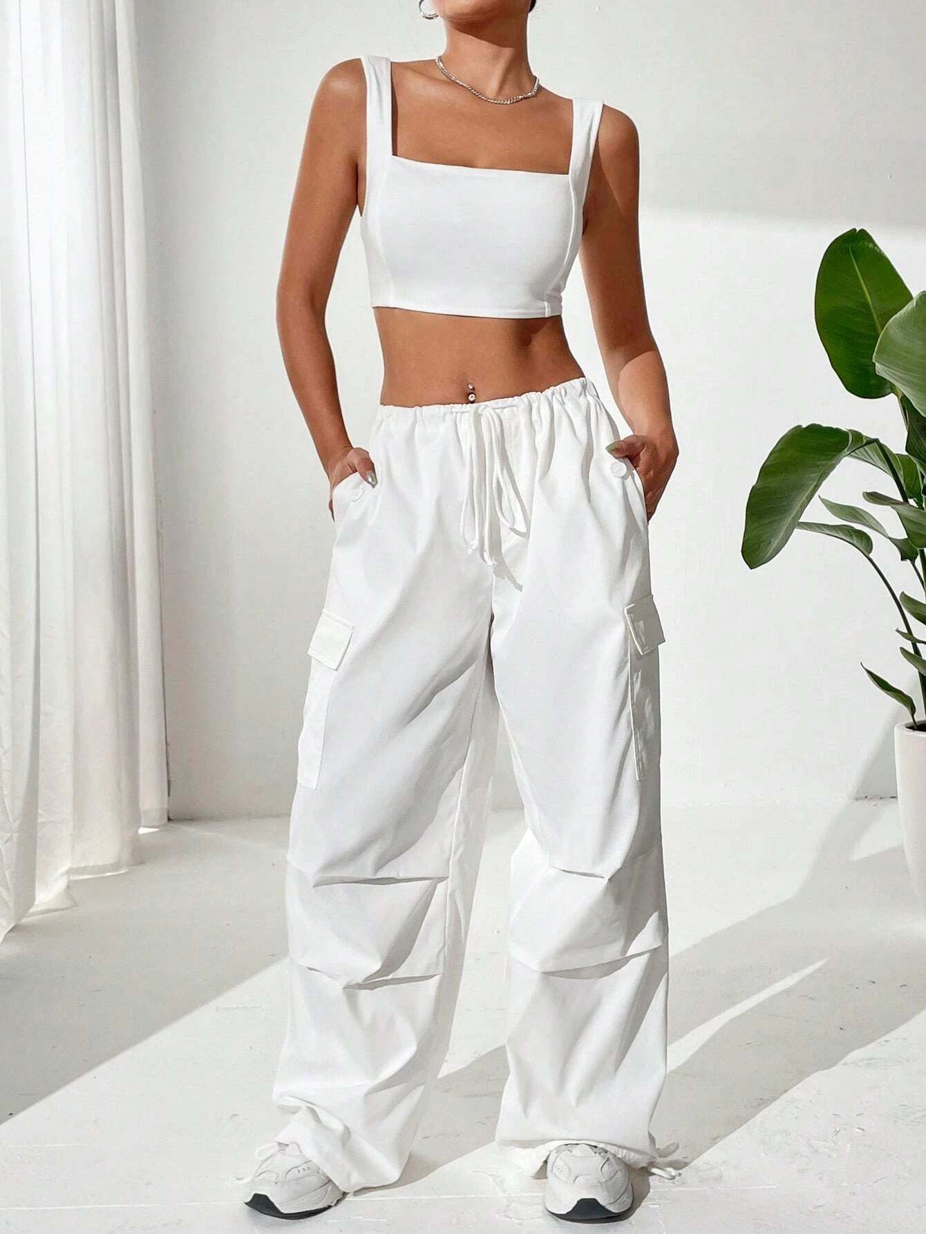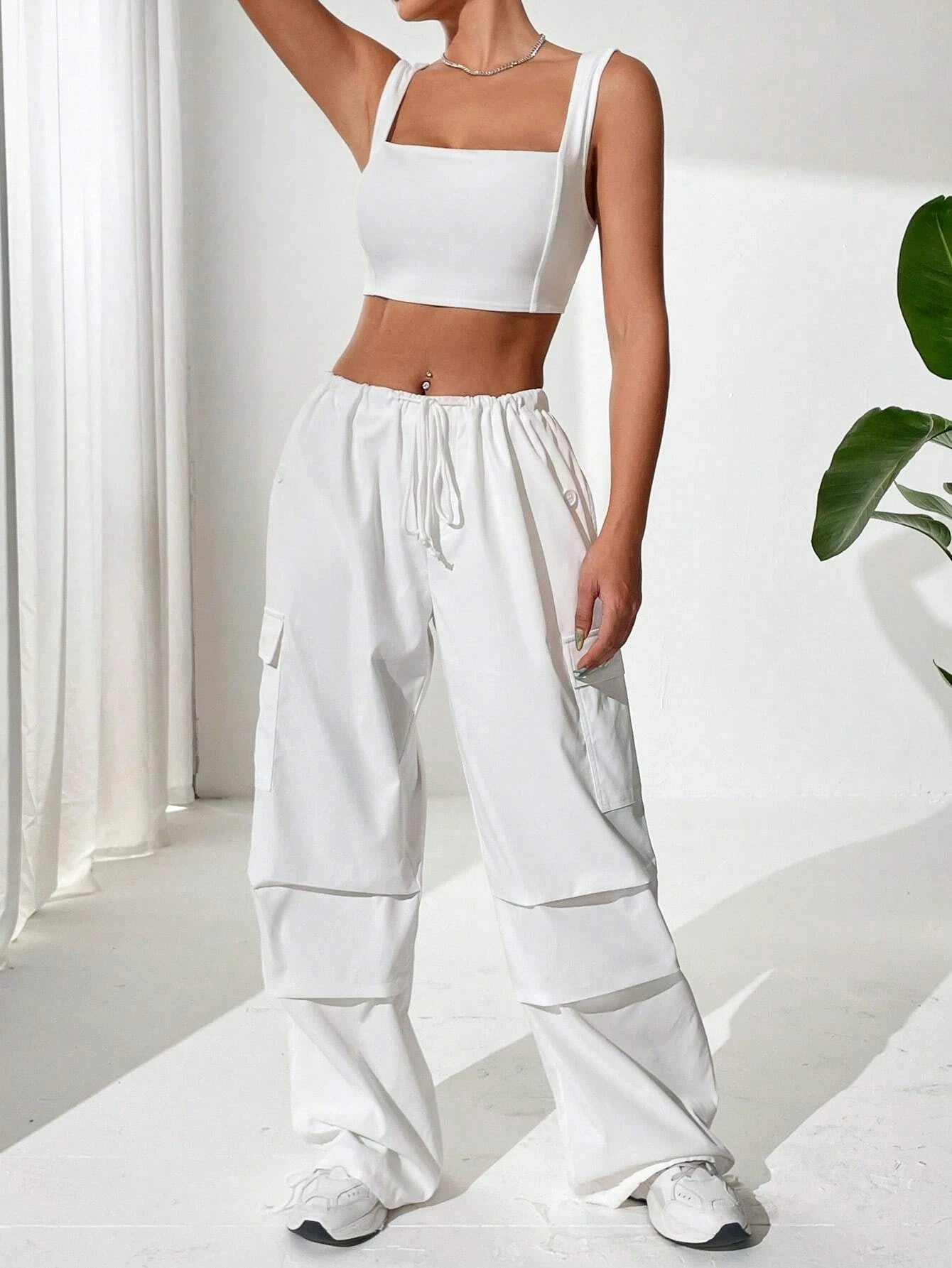 Introducing our Top And Drawstring Cargo Pants, the epitome of style and functionality. Crafted from woven fabric, these pants offer a regular fit and non-stretch comfort. The drawstring and pocket details add a touch of versatility, while the tank tops & camis, made of knitted fabric, offer a sleeveless, strap neckline design.