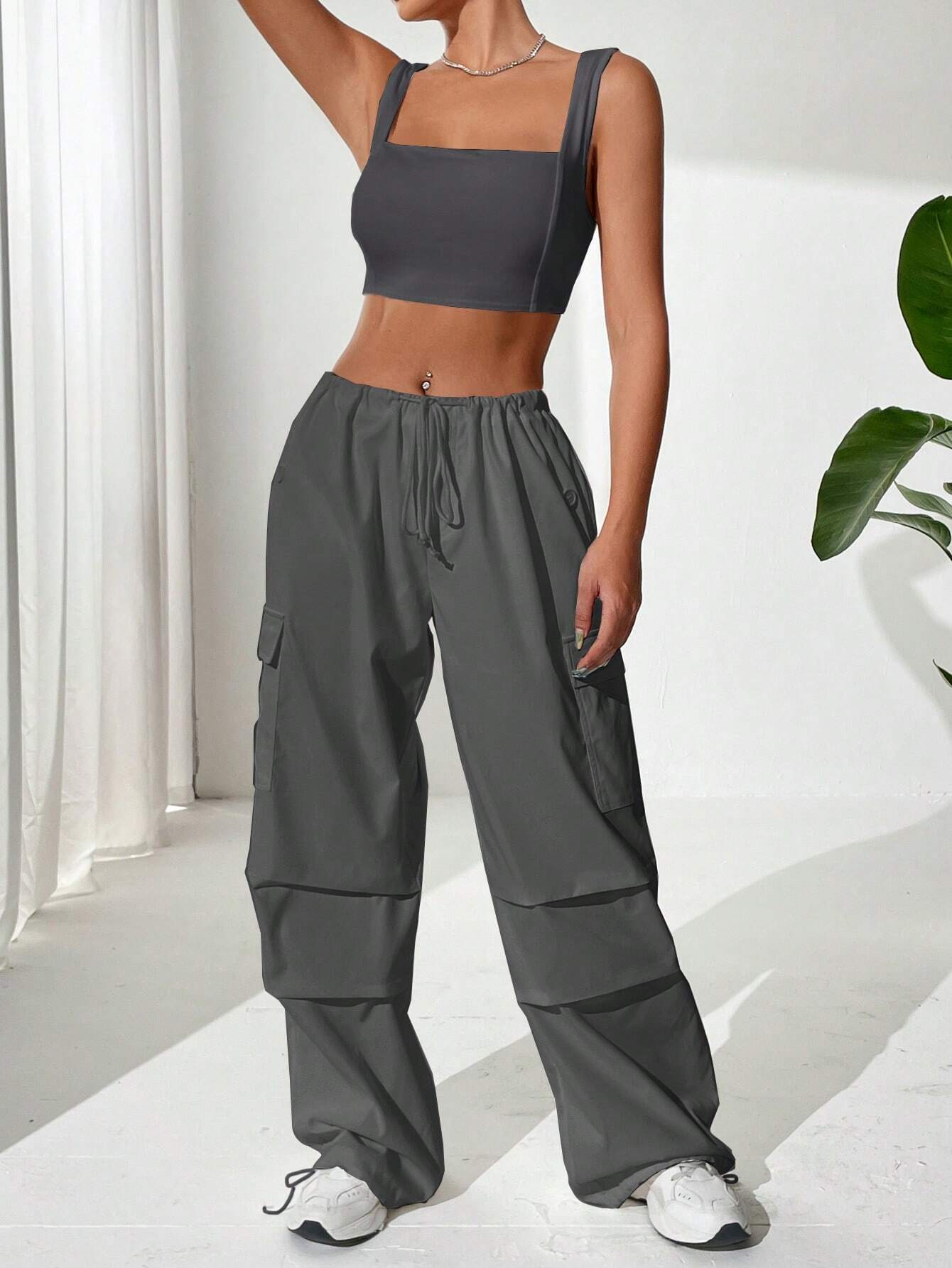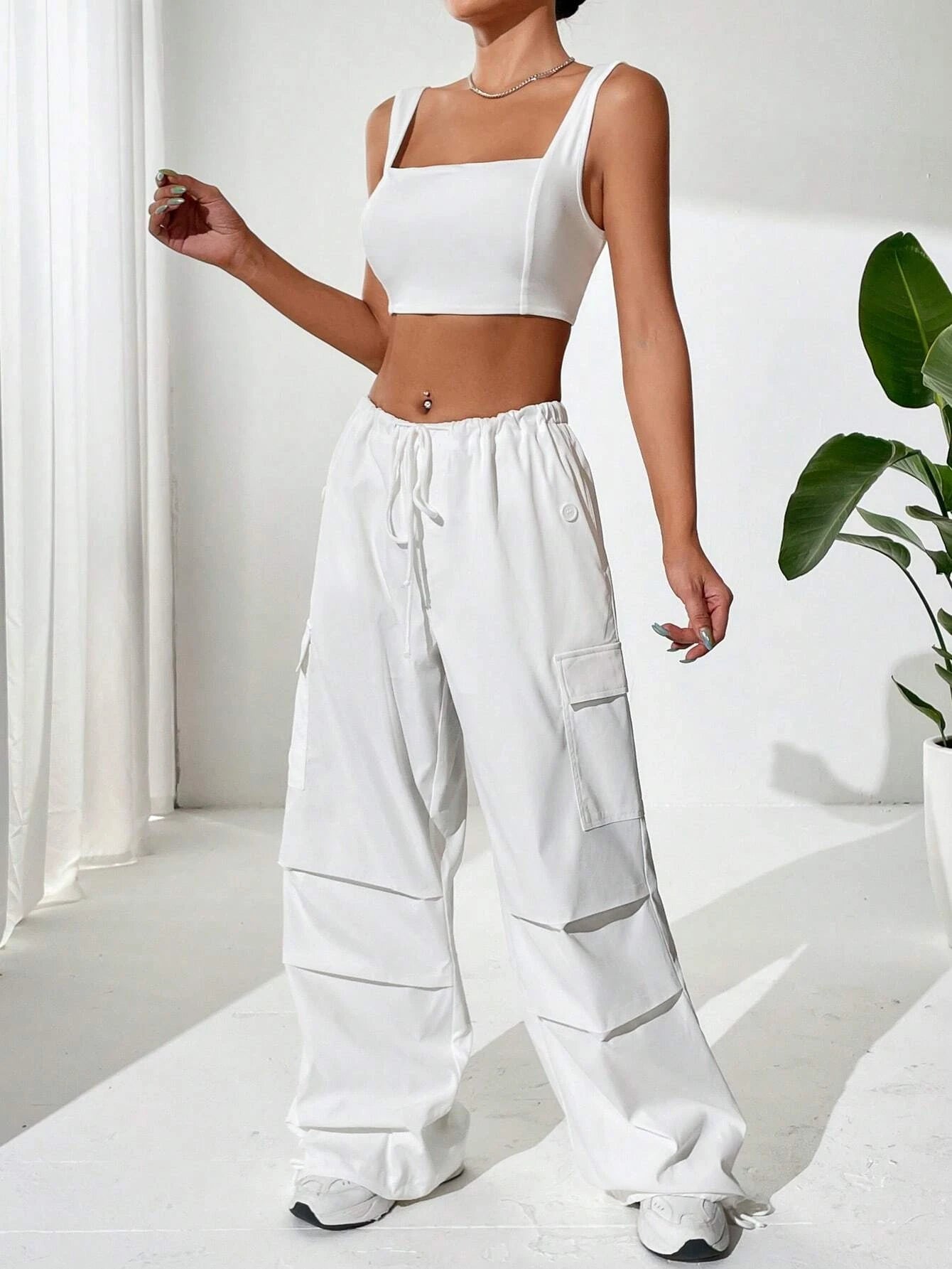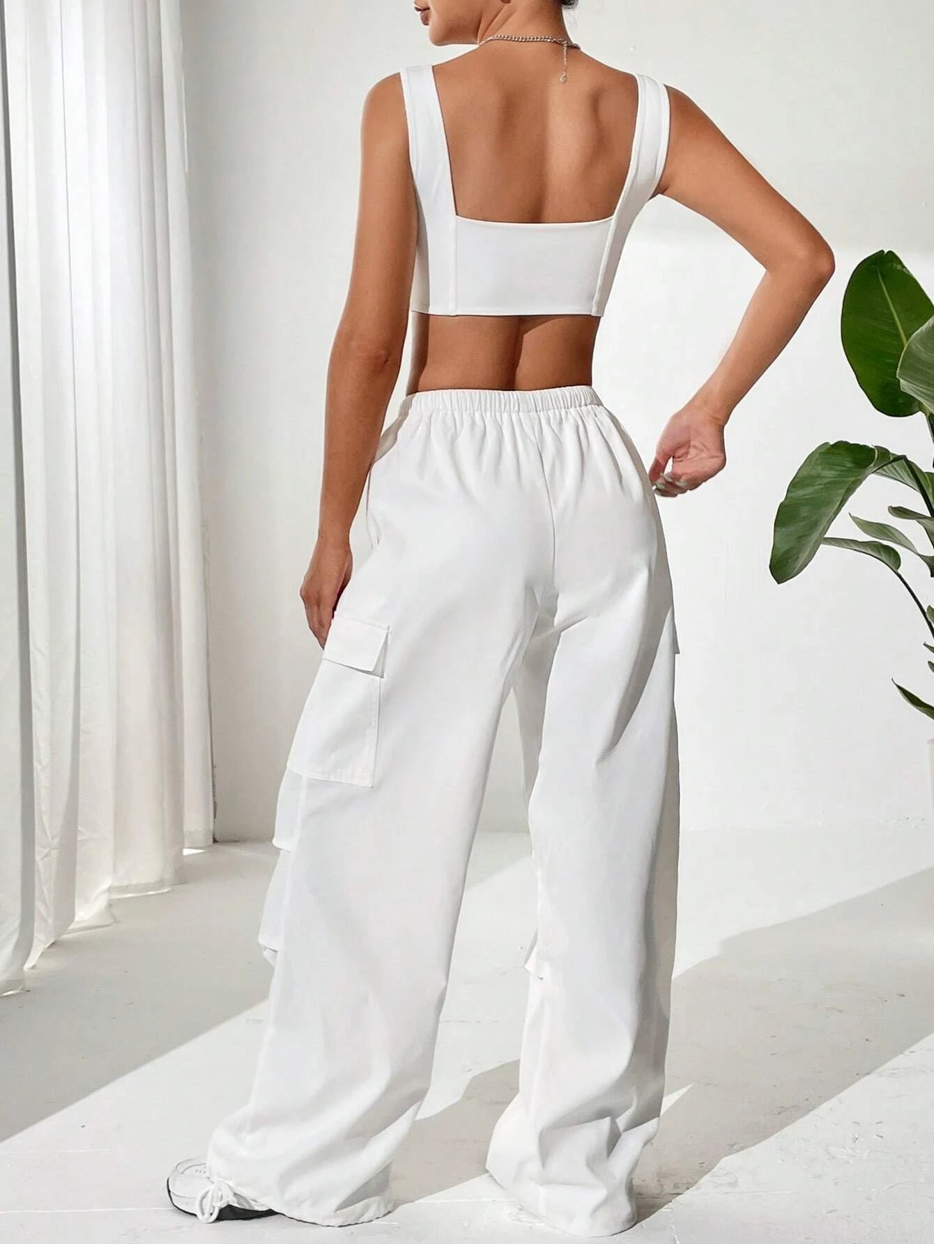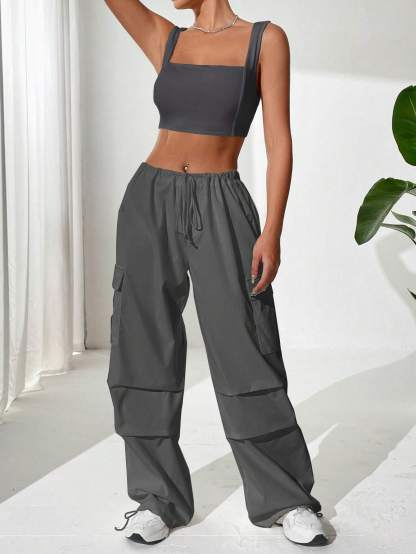 Introducing our Top And Drawstring Cargo Pants, the epitome of style and functionality. Crafted from woven fabric, these pants offer a regular fit and non-stretch comfort. The drawstring and pocket details add a touch of versatility, while the tank tops & camis, made of knitted fabric, offer a sleeveless, strap neckline design.