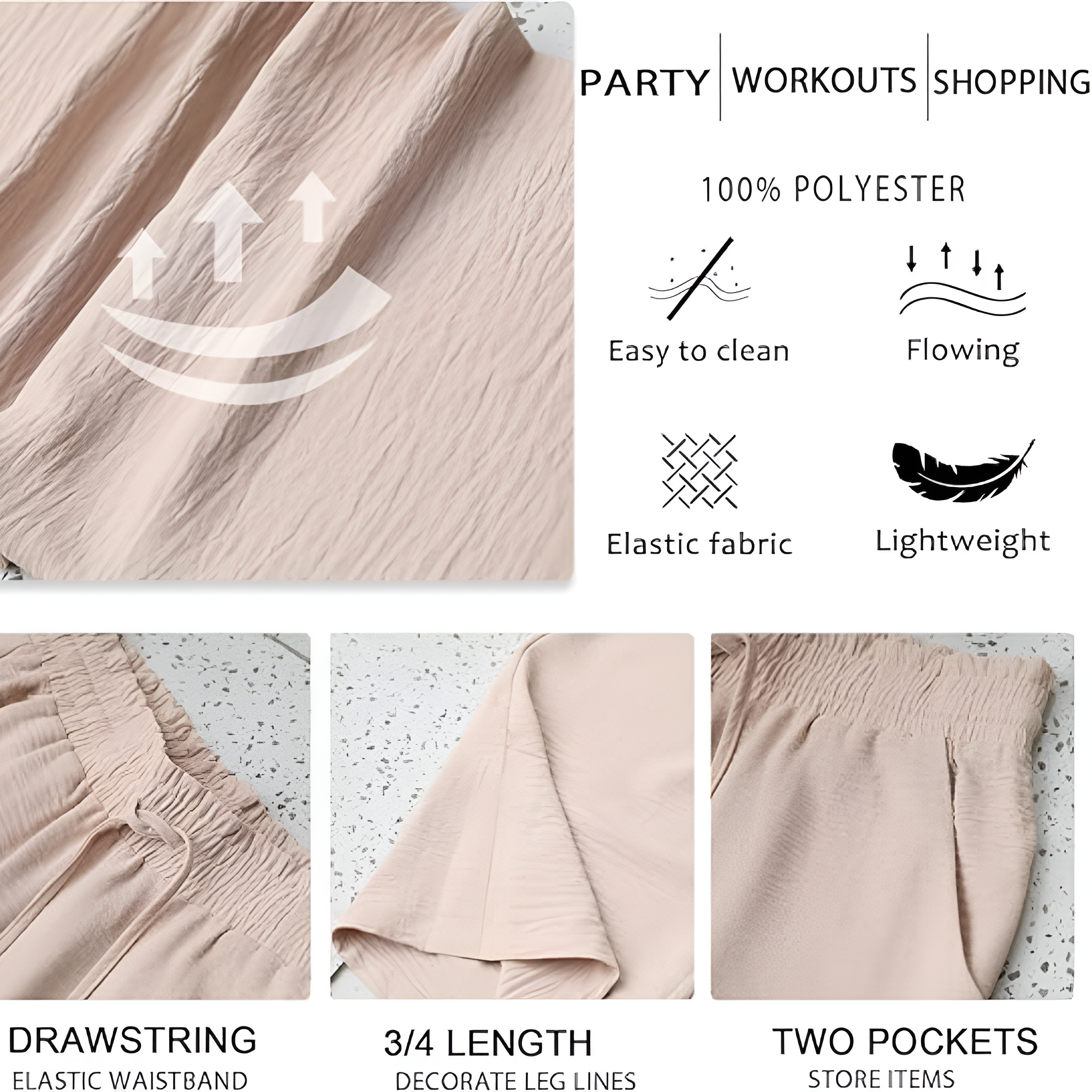 These capri pants are designed for people who want comfort without giving up style. The loose, wide shape creates a soft and flowing appearance that feels easy to wear throughout the day. Their cropped length makes them especially suitable for warm weather, helping create a light and seasonal outfit. The adjustable drawstring supports a flexible fit, while the elastic waistband adds extra comfort for long hours of wear. Side pockets provide practical storage for small essentials, making these pants useful for everyday routines, travel, and casual outings. Their simple design makes them easy to pair with fitted tops, shirts, sandals, or flat shoes for different looks. Whether worn for wearing at home, weekend errands, or vacation days, these pants offer dependable versatility. They are a great choice for building easy outfits with comfort, function, and chill everyday style.